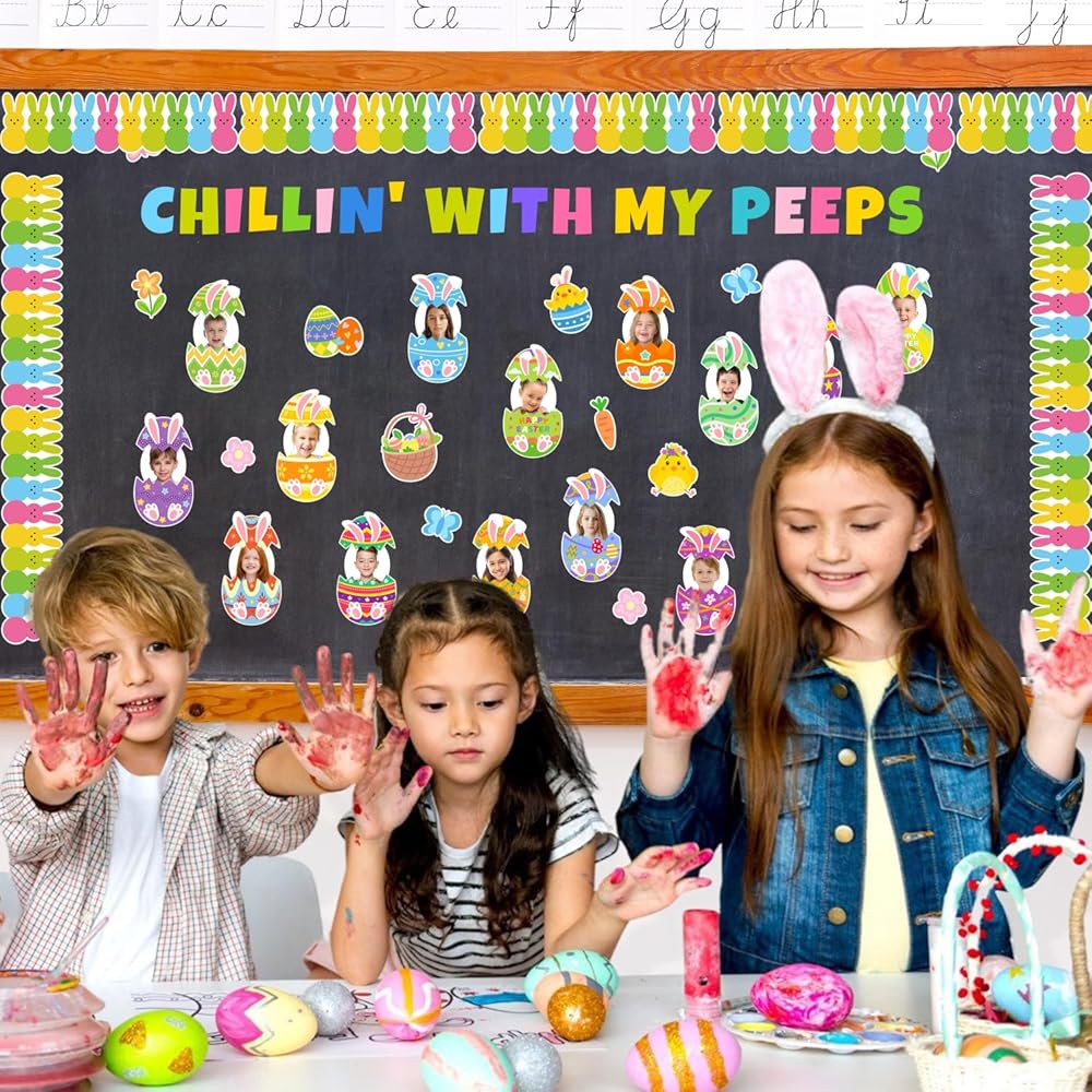 Photo Egg Fun - Turn your easter bulletin board into a class showcase: egg frames invite kids to add photos, self-portraits, or name tags for a sweet “Chillin' With My Peeps” community wall.