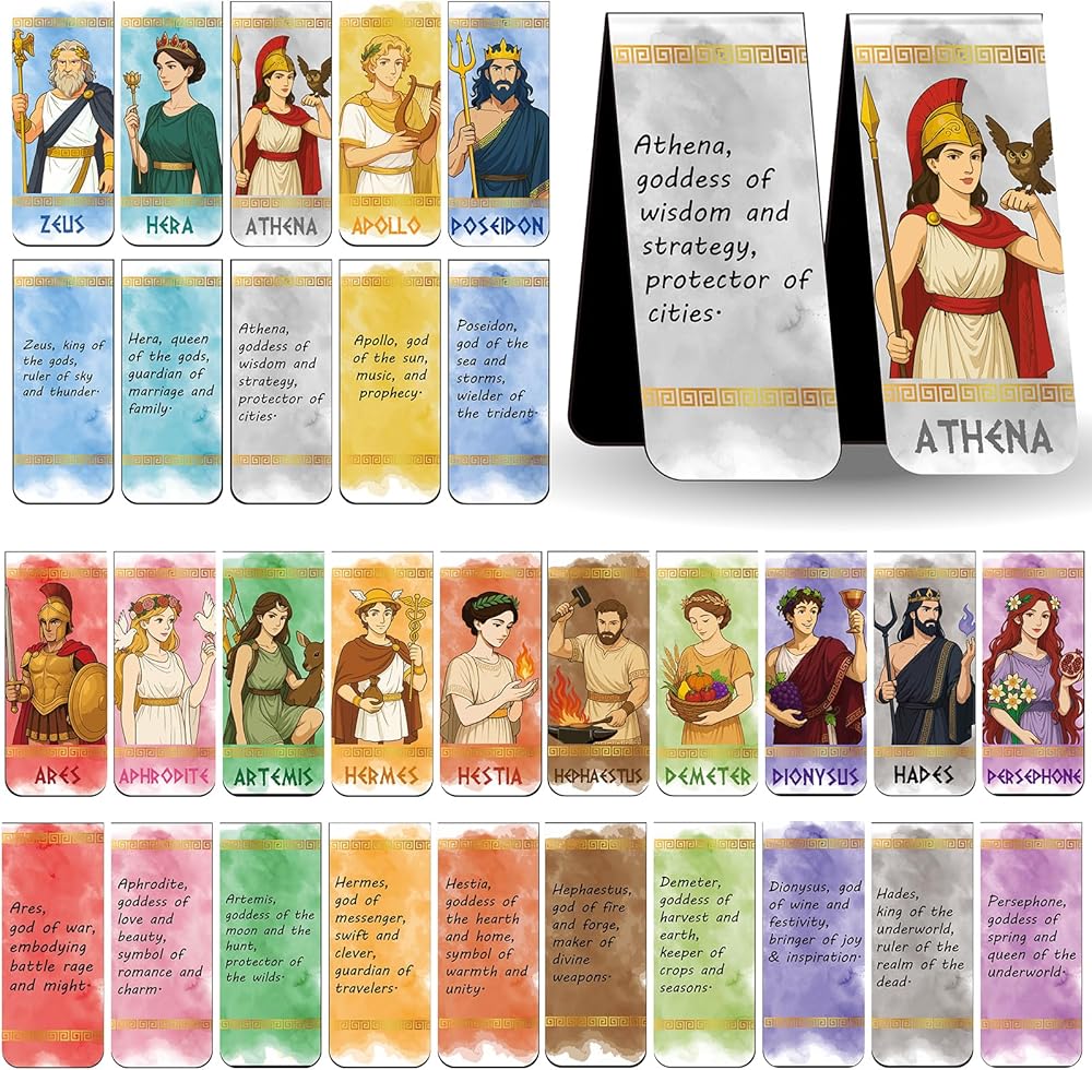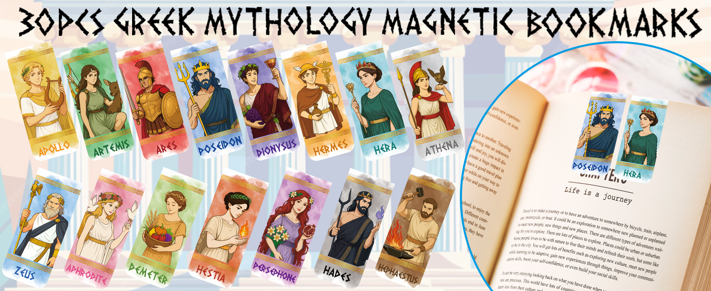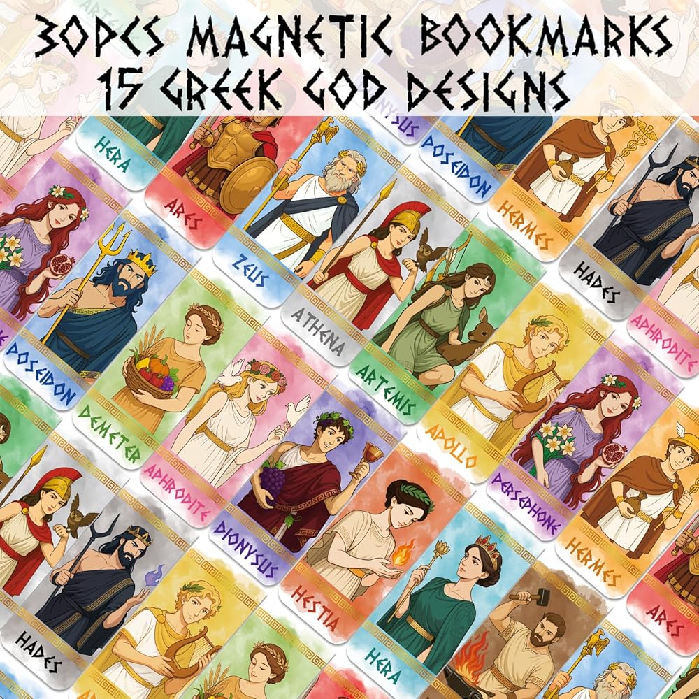 Greek Mythology Magnetic Bookmark Clips - 30 Greek gods bookmarks in 15 Greek gods and goddesses designs (2 each) for sharing, gifting, or marking books. Features 15 designs: Zeus, Hera, Athena, Poseidon, Apollo, Artemis, Ares, Aphrodite, Hermes, Hestia, Hephaestus, Demeter, Dionysus, Hades, and Persephone. Ideal for novels, textbooks, journals, and planners; Greek mythology classroom rewards, reader gifts, and Greek mythology party favors.
