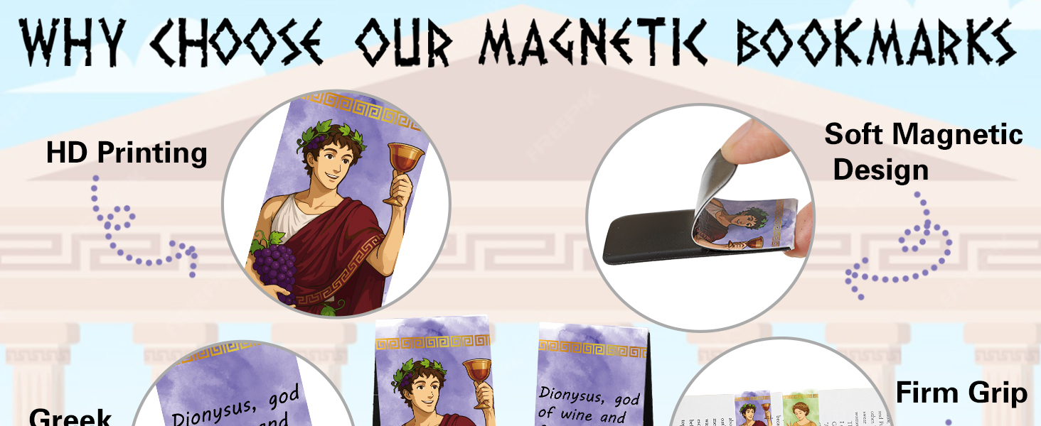 Greek Gods Magnetic Bookmark Clips That Stays Put - Made with soft magnetic material, these Greek god bookmark clips snap onto the page for a firm hold and won't slide during normal reading. Gentle on paper and easy to open, they keep your place as you change chapters and mark multiple sections. Perfect for daily reading, studying, and note-taking in paperbacks, hardcovers, recipe books, and Bible study books.