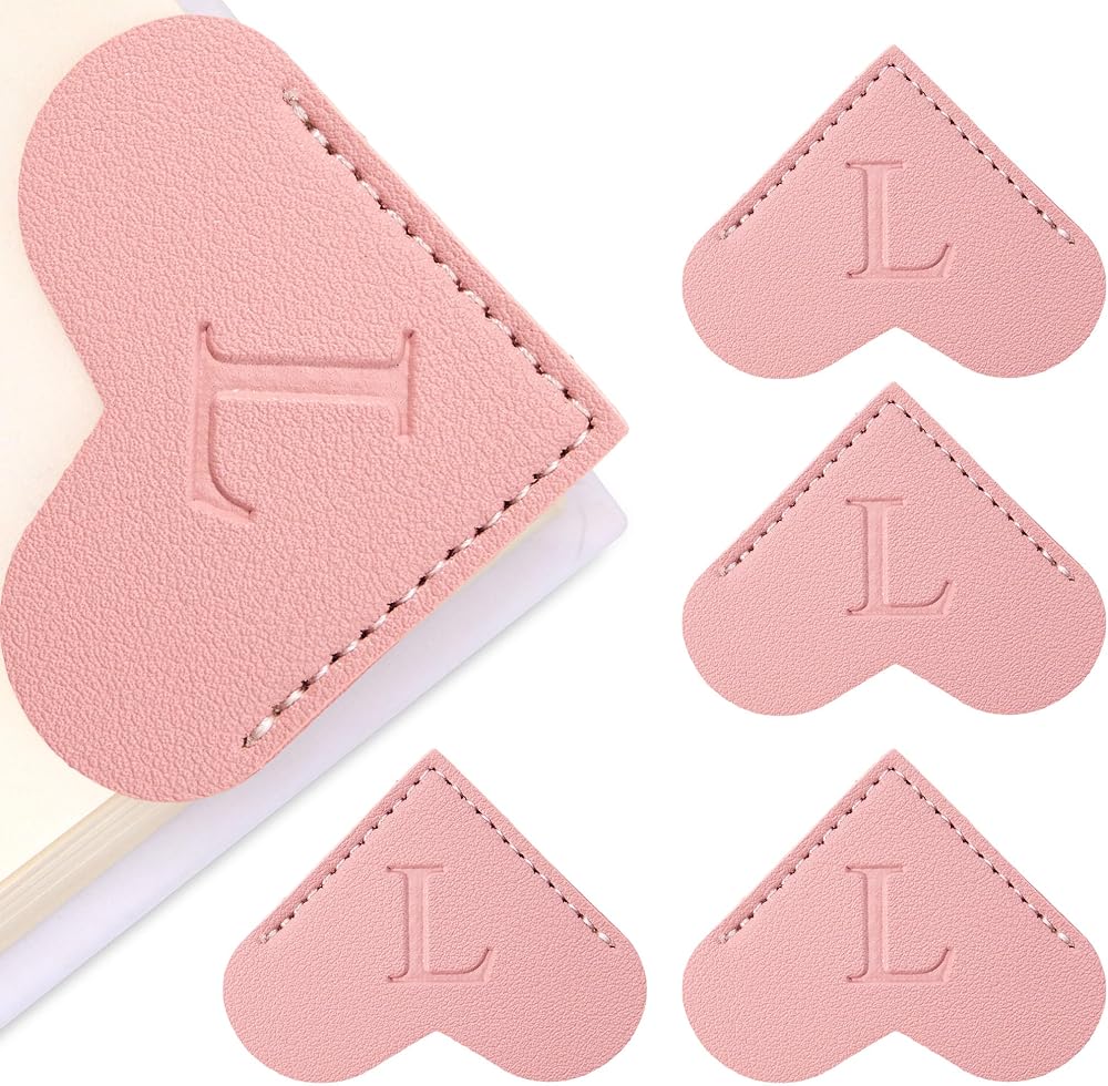 4 Pcs Leather Heart Bookmarks,26 Initial Letter Cute Heart Bookmark Corner, Book Marks for Teachers Students School Office Home Supplies(Pink, A)
