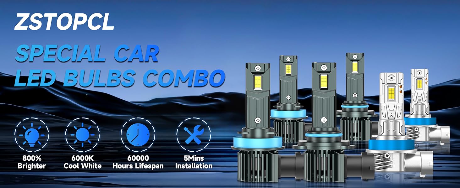 【Upgraded 800% Brightness】ZSTOPCL latest 6000K cool white light bulb adopts a double-sided 16pcs CSP chips design, with a full light pattern and no black spots. It can emit 44000LM, which is 800% brighter than the original car halogen lamp, making your night driving vision clearer and enjoying the fun of night driving