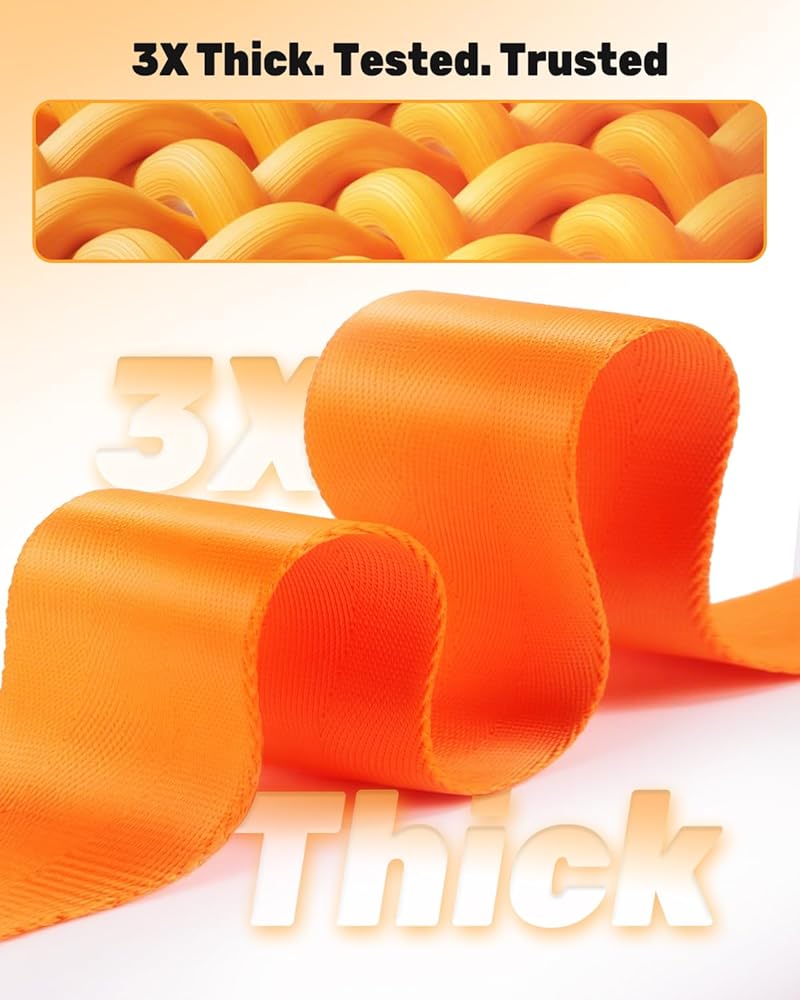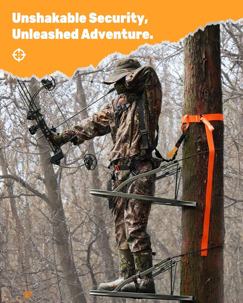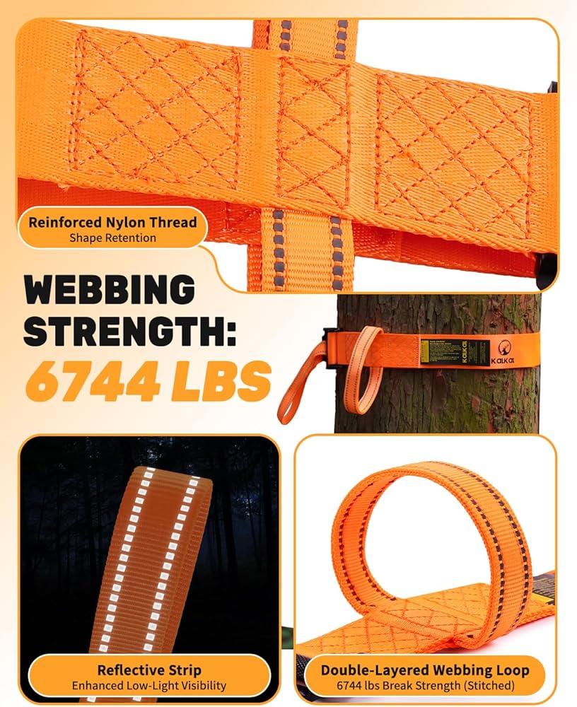 Safety—3-Ply Reinforced Webbing: The Tree Strap for Hunting features heavy-duty, thickened webbing with double-layer nylon stitching. Laboratory-verified to withstand 6,744 lb of force, it ensures a secure connection between your safety harness and the tree. TIPS: The included carabiner is rated for 5,512 lb—please ensure your total load does not exceed this limit for safe operation.