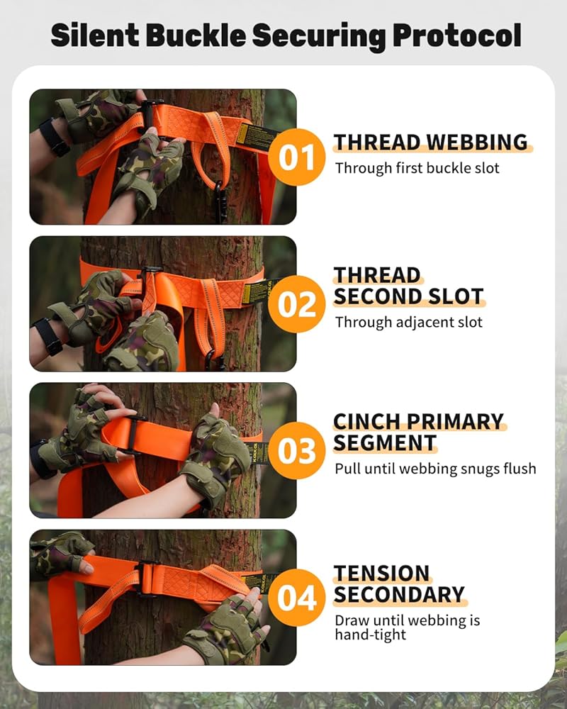 360° Locking Silent Carabiner: Every Tree Strap includes a free D-ring locking carabiner with an enlarged gate for easy one-handed clipping and a built-in 360° rotating lock ring that clicks securely into place—delivering noise-reduced, sway-free harness attachment essential for hunting success.