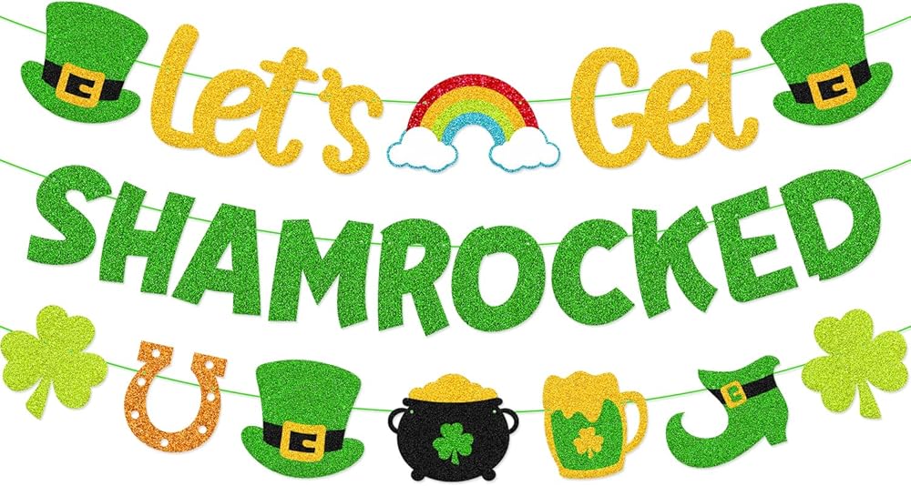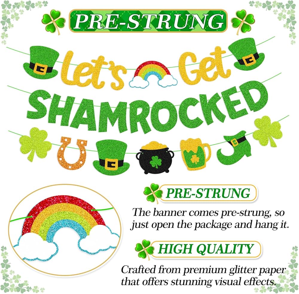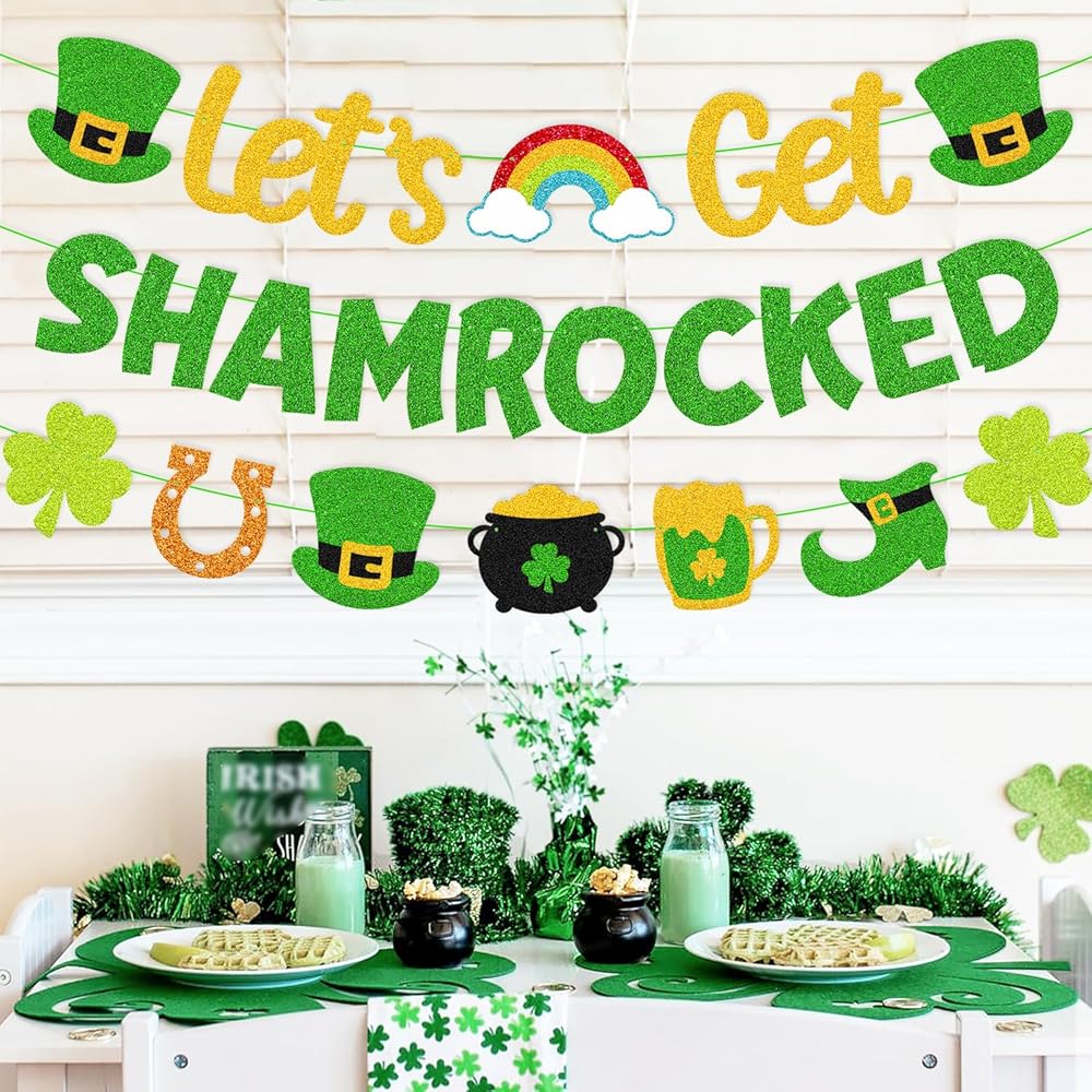Let’s Get Shamrocked Banner Happy St. Patrick’s Day Decorations Irish Holiday Party Supplies Glitter Green Saint Patrick Theme Classroom Bulletin Board Décor