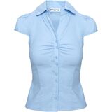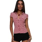 Short sleeve shirt, check top. Classic collar, double button closure, petal sleeves, tie-back detail . Non-stretch material