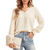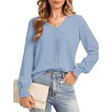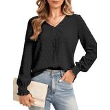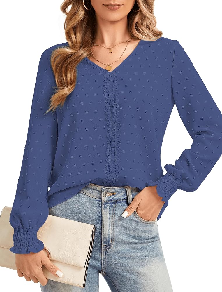 【Elegant & Business Design】Womens Long Sleeve Blouses Dressy Chiffon Shirts featureed chic swiss dot pattern fabric, classic v neck design decorated with cute front ruffle trim lace, highlight your neck lines. Crafted lantern sleeves featuring charming smocking details, loose fit button down shirts can hide belly well to look slimmer, and create elegant style