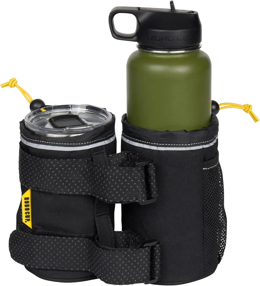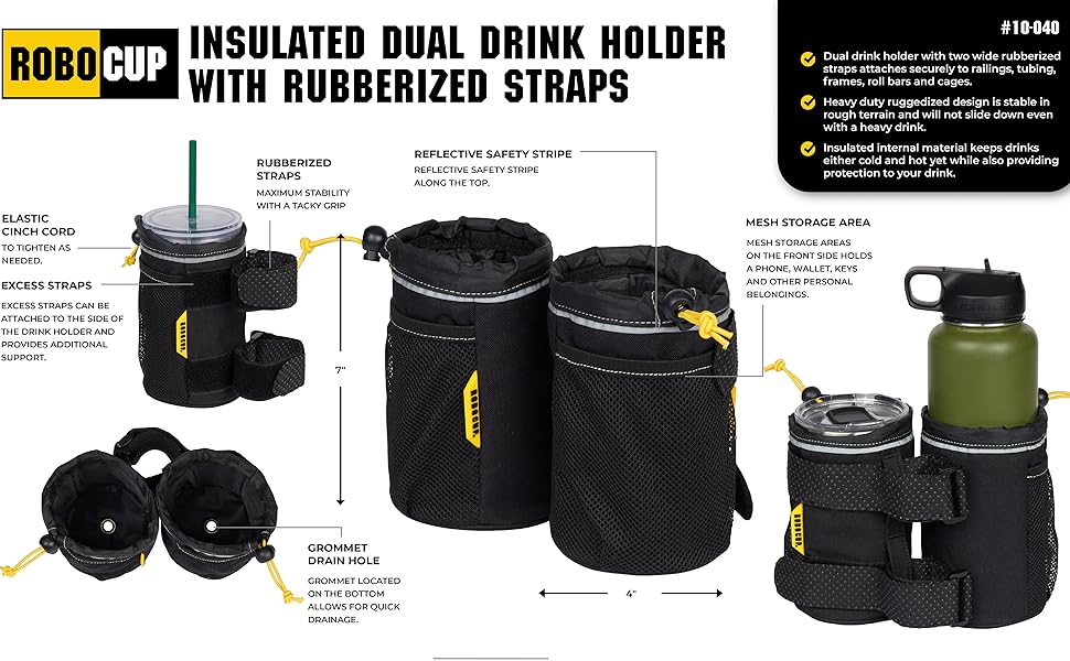 DUAL drink holder with a heavy duty ruggedized design that's stable in rough terrain and will not slide down even with a heavy drink. Tested extensively both in the Mojave Desert on a high speed off-road car blasting through rough terrain and in the Pacific Ocean with a boat hitting choppy waters.