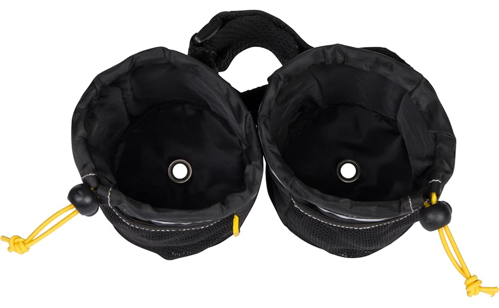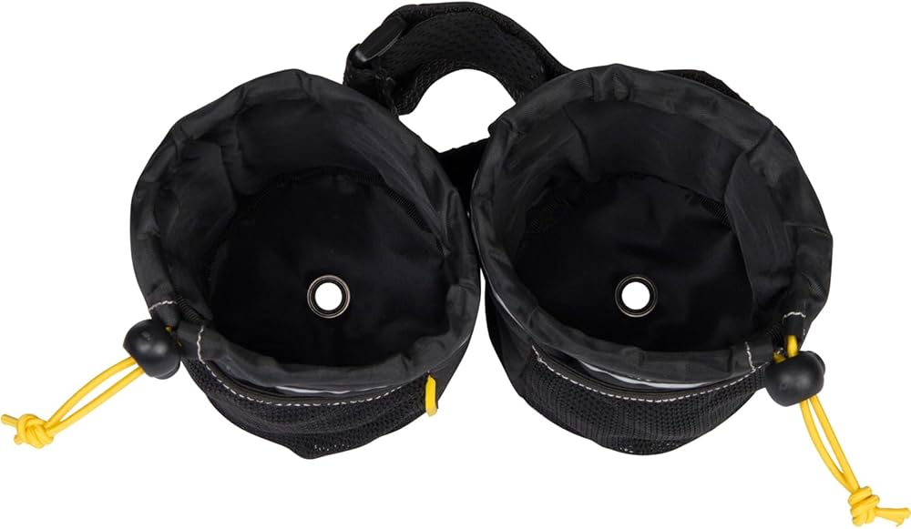 The reflective safety stripe along the top for visibility and an elastic bungee cinch cord to tighten as needed. The large mesh storage areas on the front side holds a phone, wallet, keys and other personal belongings.