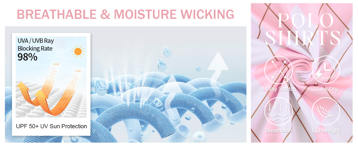 Material: The women's short sleeve golf shirt is made of moisture wicking fabric, which is sweat absorption, quick dry, wrinkle free, anti-pilling, SPF UPF 50+ sun uv protection, stretchable, lightweight but not see through, brings you better movement experience.