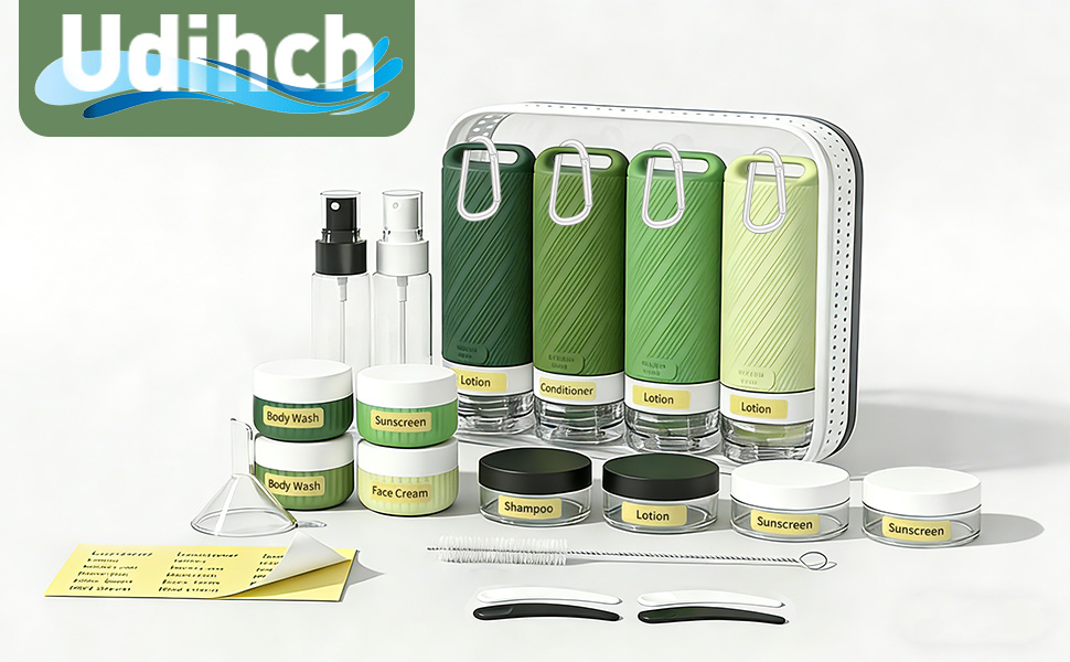 26 Piece Travel Toiletry Containers: 4 travel bottles (3 oz),4 travel jars (1 oz),4 small jars, 4 scrapers, 4 carabiner, 2 spray bottles,1 funnel,1 cleaning brush,1 label sheet,1 transparent toiletry bag. Different accessories meet your diverse needs