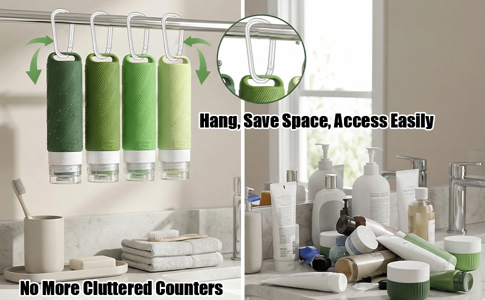 Convenient Hook: Four large-capacity travel bottles feature hanging loops at the base, allowing them to be attached to carabiners for suspension in bathrooms, gyms, or hotels. This saves counter space and enables quick access to skincare and haircare products
