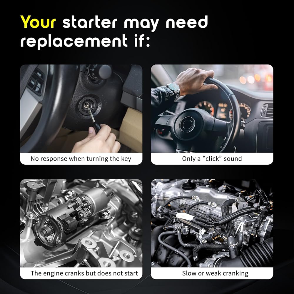 🚗【Signs of a Bad Starter Motor】: No response or only clicking when turning the key, slow cranking, free spinning with grinding noise, and stuttering are all signs that your starter motor needs replacement.✅