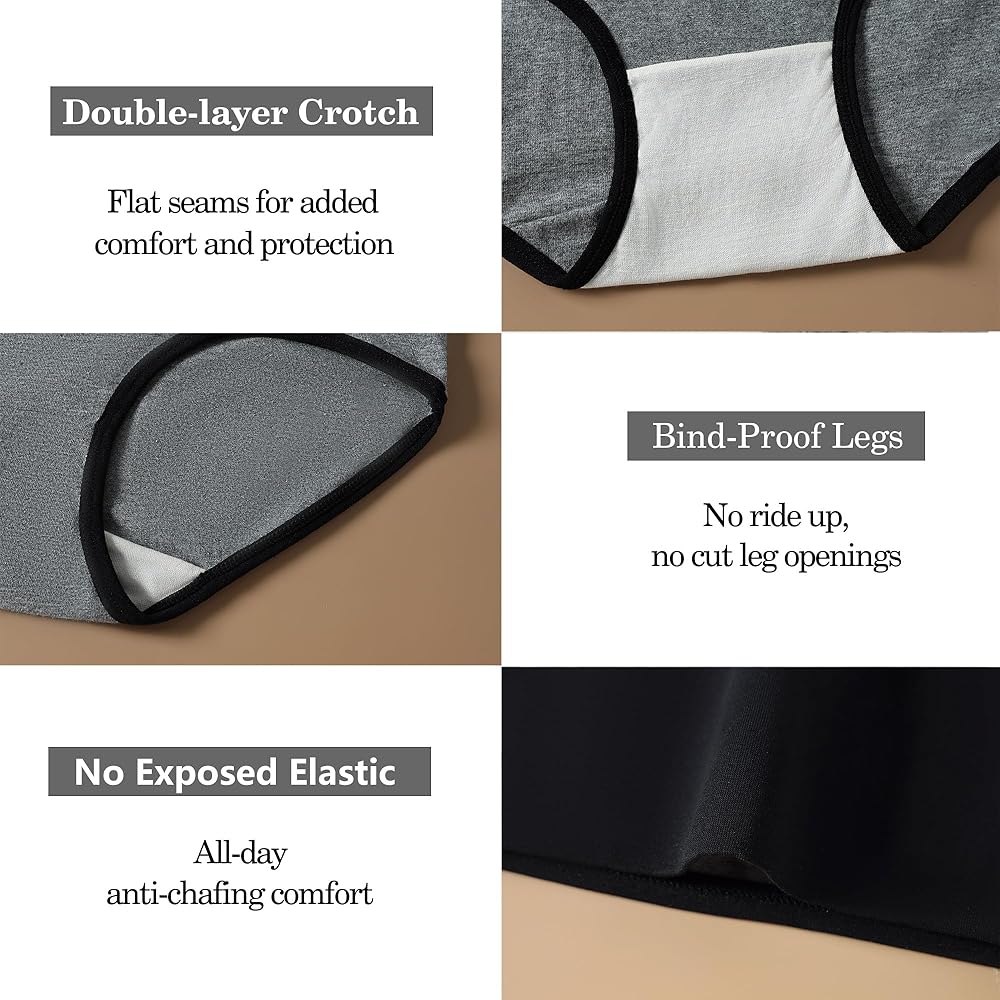 SOFT & COMFORTABLE COTTON FABRIC: These comfy womens underwear are made of 95% Cotton, 5% Elastane. No sagging, No binding, No pilling. This panties don't dig into skin or stretch out, the seam lines are smooth and don't irritate.