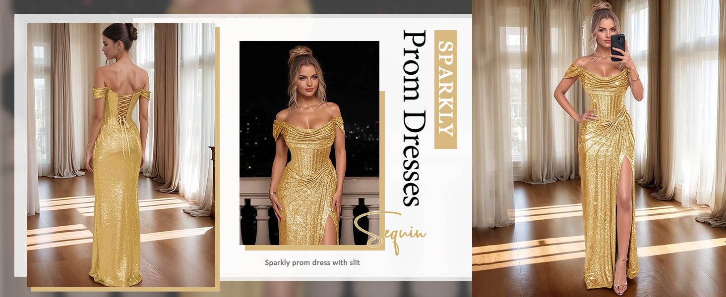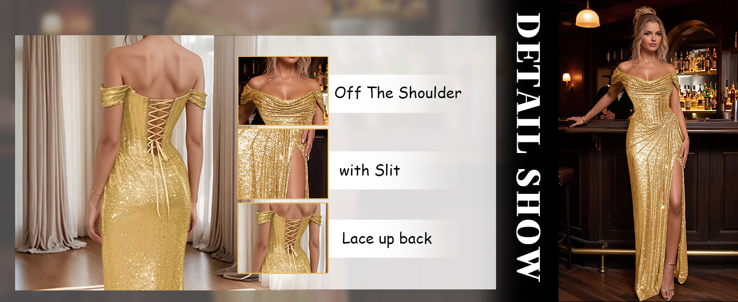 Features:prom dresses, sparkly sequin, mermaid, pleated, empire waist, bodycon, off the shoulder, maxi, wth slit. Corset makes the dress more fitting, and you also look more elegant and beautiful.