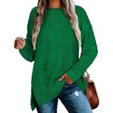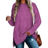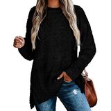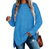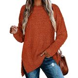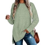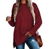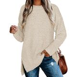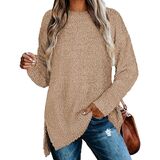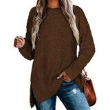 - Features: Classic crew neck, long sleeve warm sweater with side split, sherpa style. It's long enough to wear with leggings.