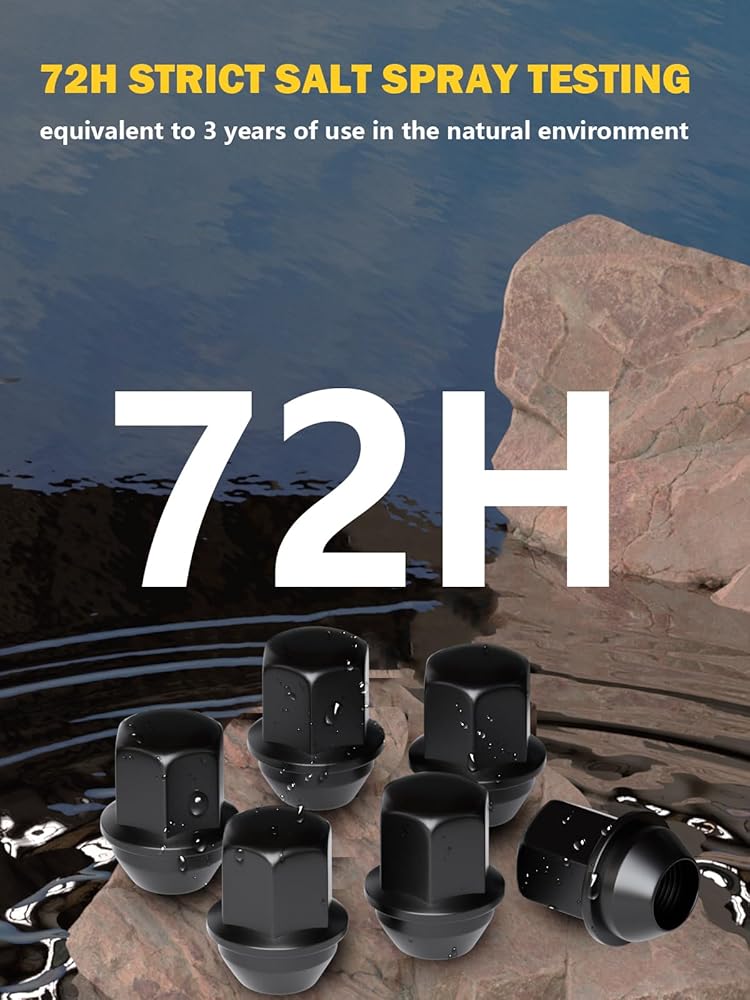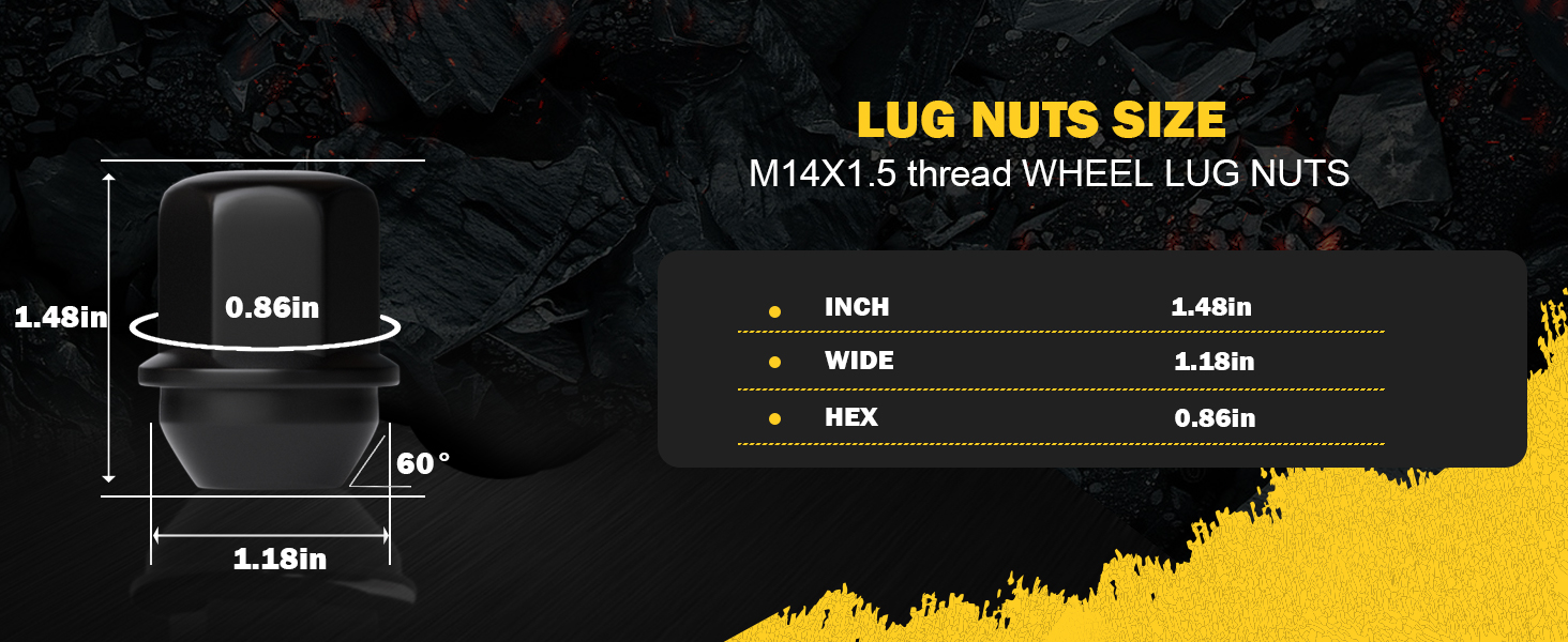 Lug Nuts Specifications: M14x1.5 Thread Pitch, 1.5”(38mm) Overall Height, 1.18" (30mm) Diameter, 7/8" (22mm) Hex , 60° Conical Seating, Bulge Acorn.All of our lug nut past 72 hours salt spray tested which can promise a longer service life