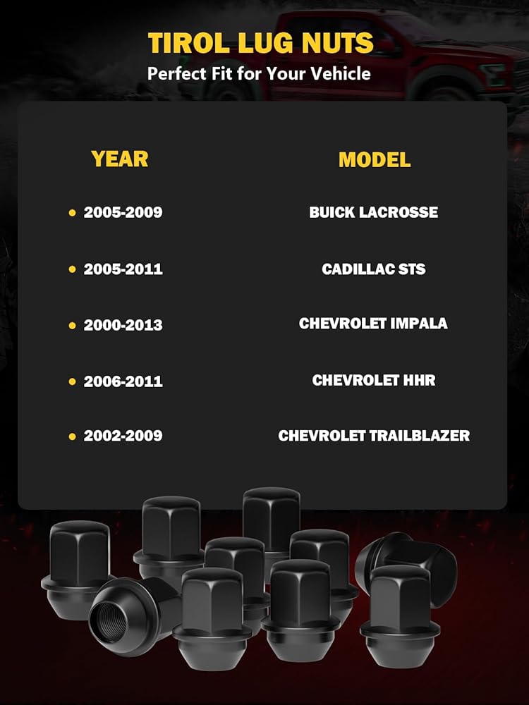 Installation: Aftermarket wheels with 5 studs which require this lug nuts.Please use hand wrench to install,not use the Power Impact Wrench