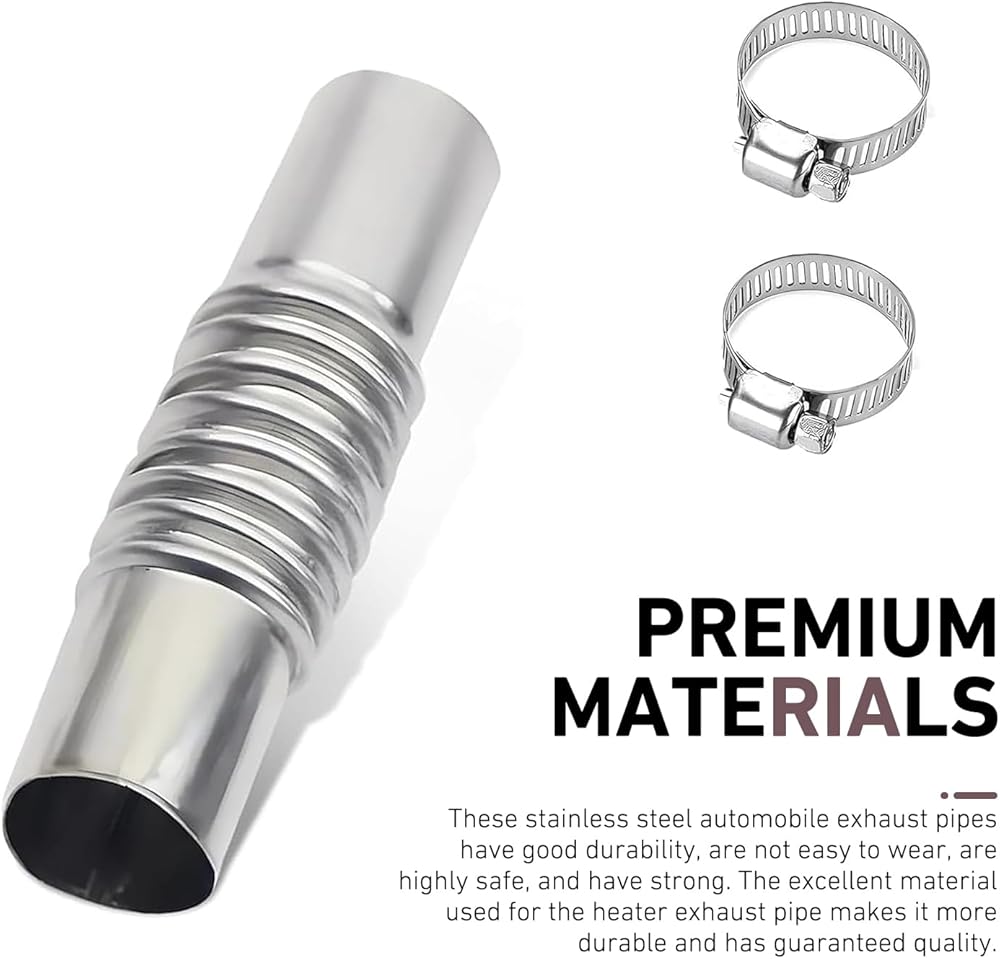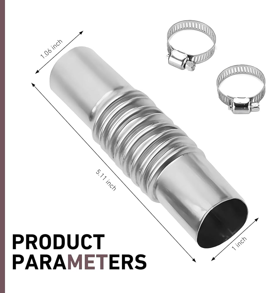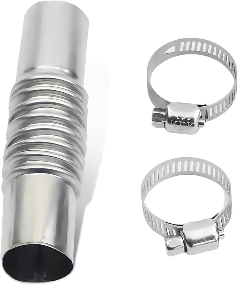 Complete Set: You will receive 1× stainless steel corrugated pipe connector (5.11 inches × 1.06 inches × 1 inch) and 2× adjustable stainless steel clamps, enabling direct replacement of aged or cracked exhaust pipes. Please note to regularly clean and inspect the exhaust pipe condition to ensure vehicle operational safety.