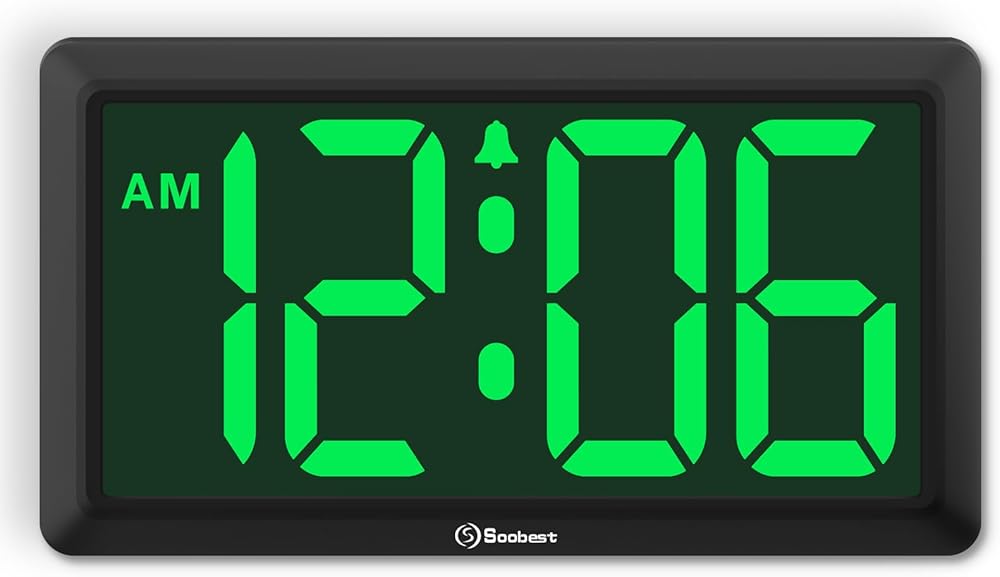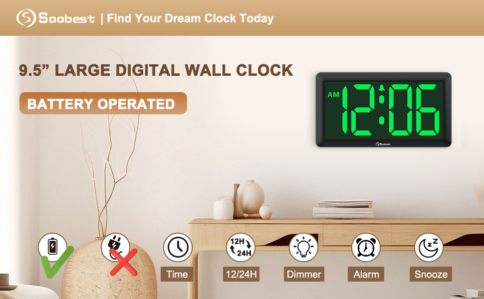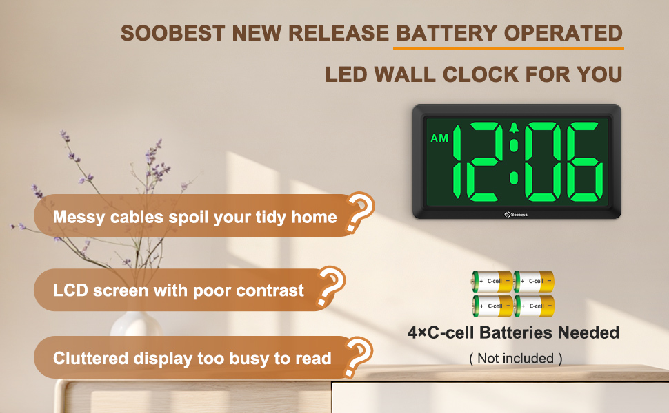 Soobest Large Digital Wall Clock Battery Operated, Auto & Manual Dimmer LED Display, Easy to Read Big Digits with Alarm for Seniors, Modern Decor for Living Room, Bedroom, Office Wall/Desk