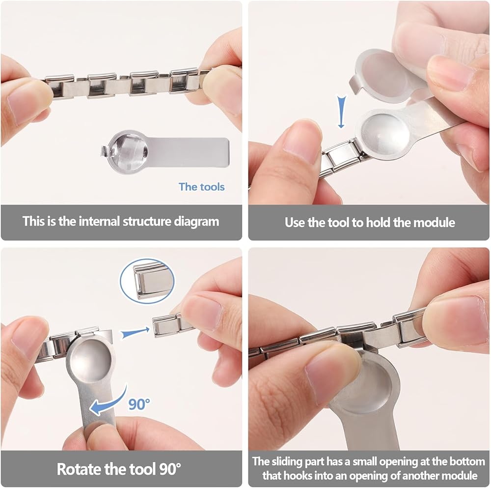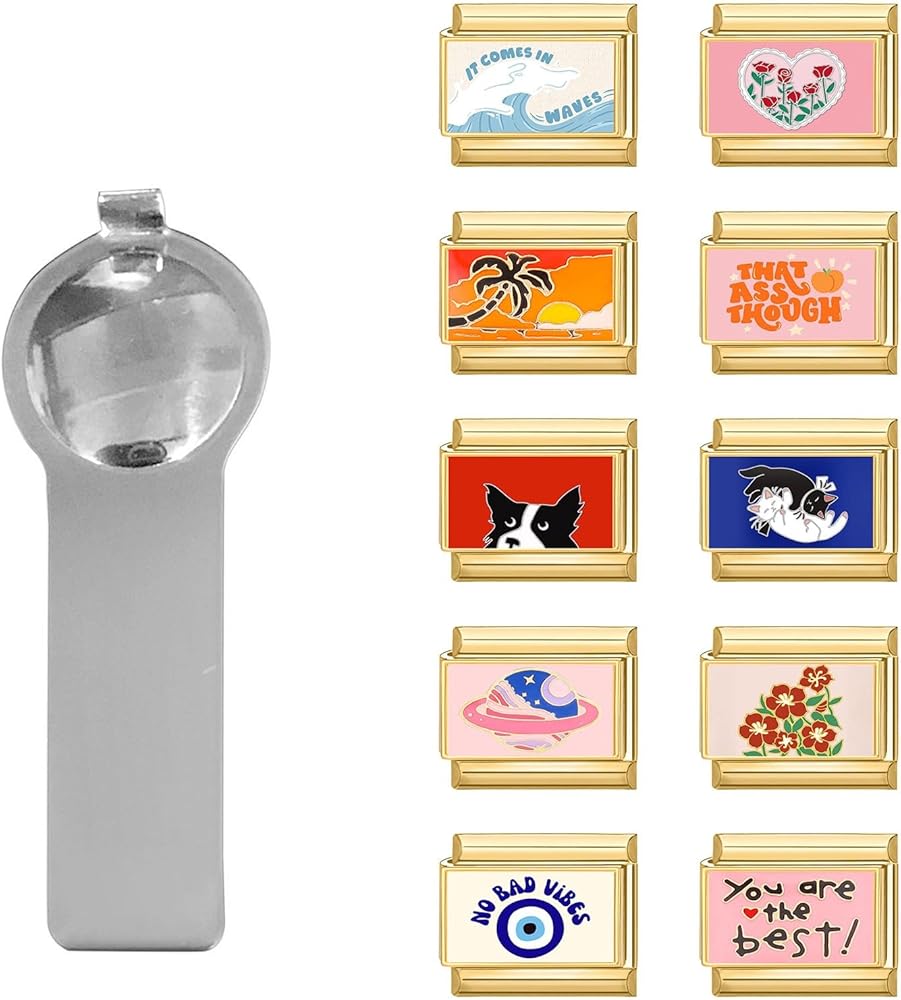 Only Charms and Tools: you will receive 1 thumb charms tools, 8Pcs Popular 10mm*9mm Italian Charms; Each tool measures about 2.17 x 0.51 inches/ 55 x 13 mm,which is suitable for most bracelet sizes. It can complete the stitching of all 9mm accessories and can be interchanged and combined with other Italian Charms