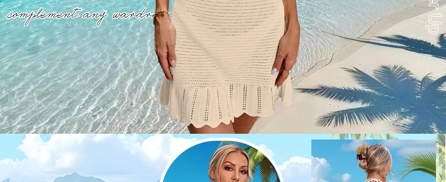 Features: Slim mini cover up with scoop neck, wide straps, hollow-out mesh, and a ruffled wave hem. Flattering silhouette, ideal for swimwear layering or standalone wear.