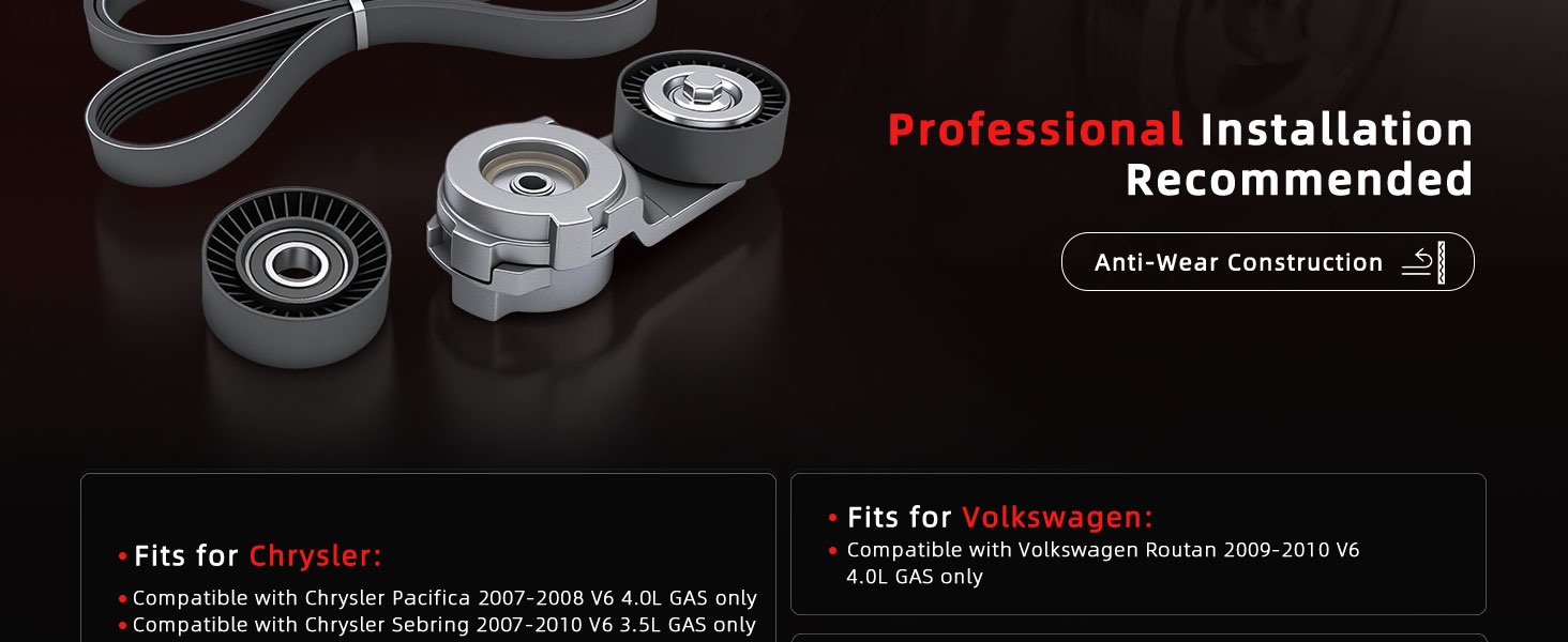 Vehicle Fitment:Tensioner Belt Set for GAS only, Fit for Chrysler Pacifica 2007-2008 V6 4.0L, for Sebring 2007-2010 V6 3.5L, for Town & Country 2008-2010 V6 4.0L; fit for VW Routan 2009-2010 V6 4.0L