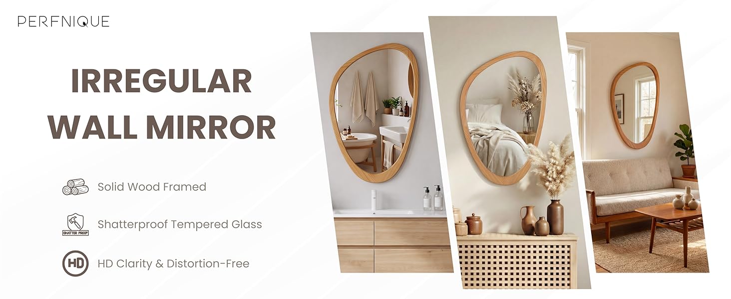 PERFNIQUE Asymmetrical Mirror, Irregular Wall Mirror, 30"x19" Tempered Glass Wood Framed Mirror for Mid Century Modern Decor, Decorative Mirrors for Bedroom, Living Room, Entryway, Vanity