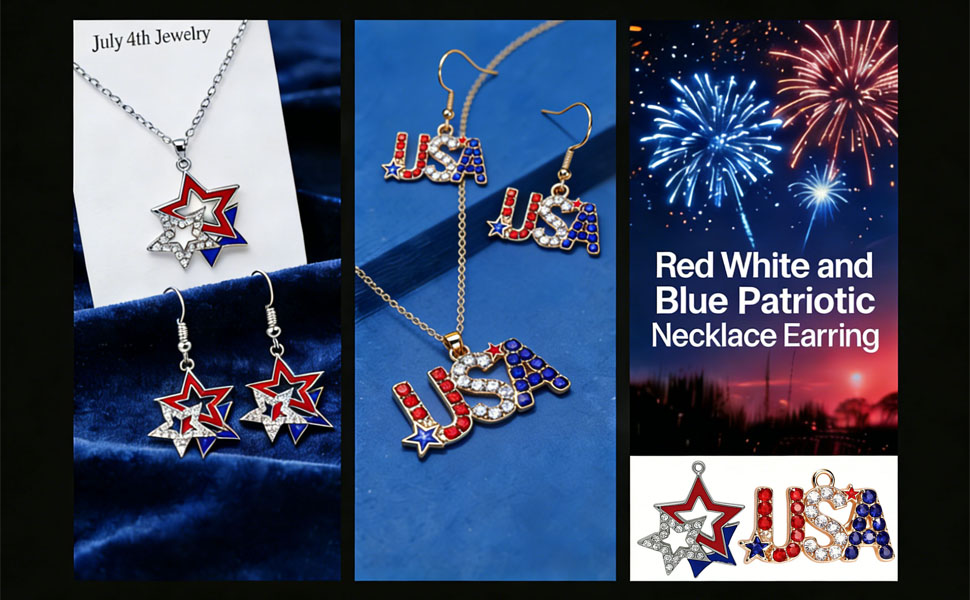 July 4th necklace and earrings set: Celebrate America with this bold set featuring star-spangled pendants, red/white/blue gemstones, and mini flag charms, perfect for July 4th parties, parades, or patriotic events.