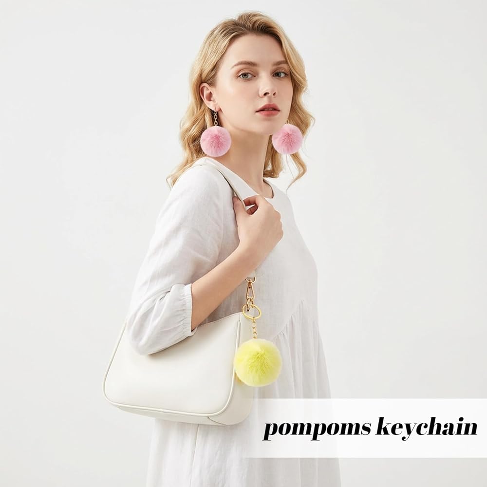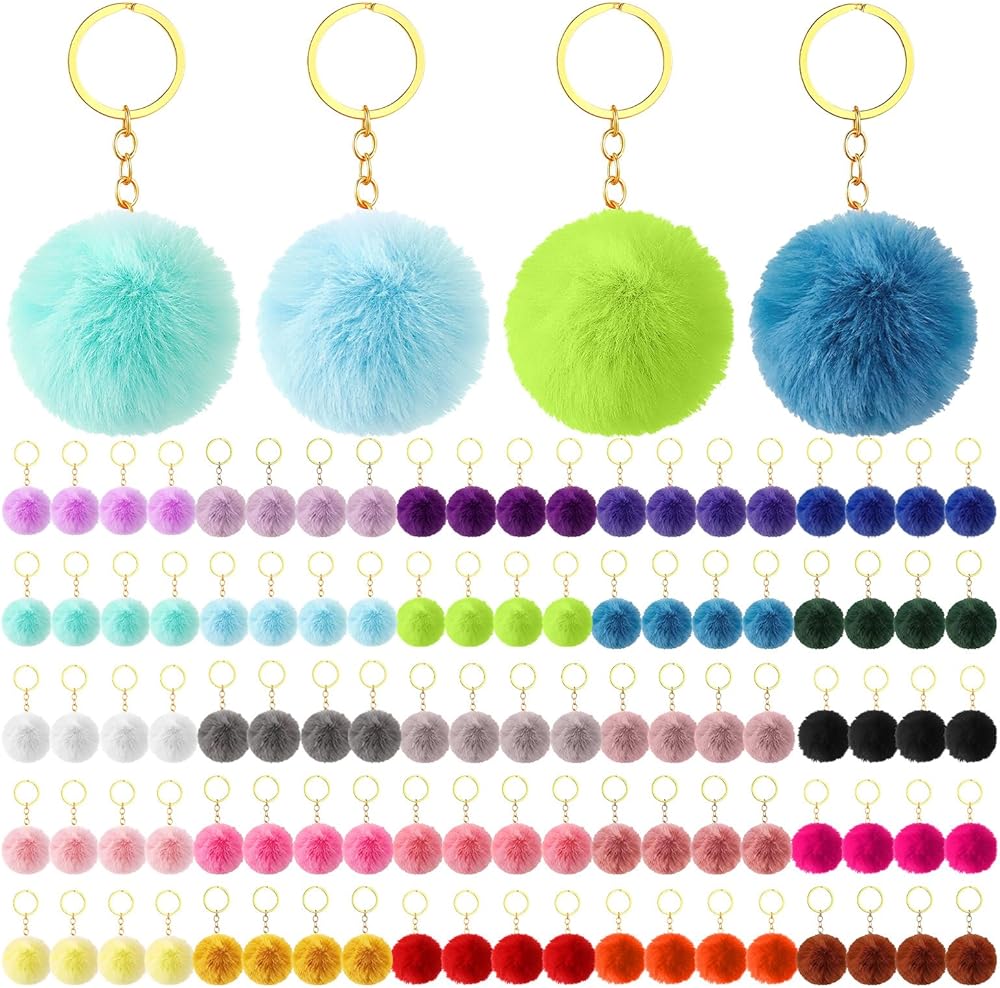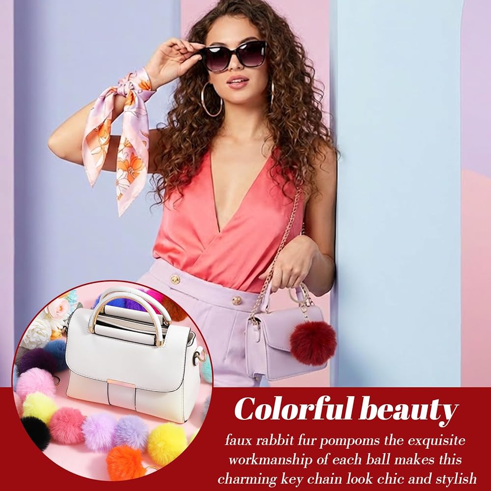 Fluffy and Premium Material: made of faux rabbit fur and metal, these colorful pom poms keychain items combine with sturdy components, with each pom measuring approximately 2.36 inches in diameter for visual presence without overwhelming effect.