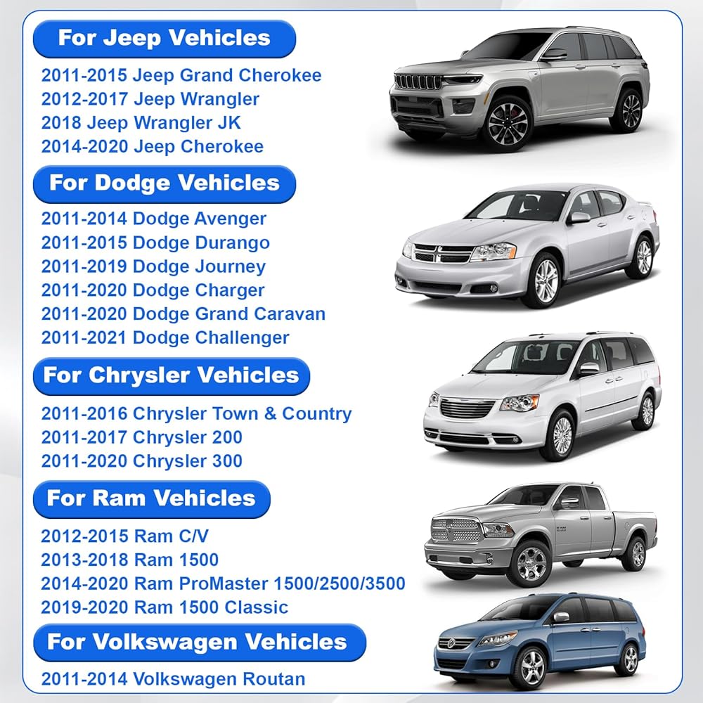 Compatibility:[Compatible with Jeep Vehicles]:2011-2015 Jeep Grand Cherokee,2012-2017 Jeep Wrangler,2018 Jeep Wrangler JK,2014-2020 Jeep Cherokee.[Compatible with Dodge Vehicles]:2011-2020 Dodge Charger,2011-2020 Dodge Grand Caravan,2011-2019 Dodge Journey,2011-2021 Dodge Challenger,2011-2015 Dodge Durango,2011-2014 Dodge Avenger.[Compatible with Chrysler Vehicles:]2011-2017 Chrysler 200,2011-2020 Chrysler 300,2011-2016 Chrysler Town & Country.[Compatible with Ram Vehicles]:2013-2018 Ram 1500,2019-2020 Ram 1500 Classic,2014-2020 Ram ProMaster 1500/2500/3500,2012-2015 Ram C/V.[Compatible with Volkswagen Vehicles]:2011-2014 Volkswagen Routan