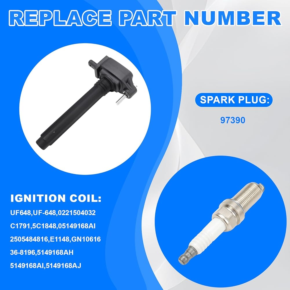 Ignition Coil Replace Part Number:UF648,UF-648,0221504032,C1791,5C1848,05149168AI,2505484816,E1148,GN10616,36-8196,5149168AH,5149168AI,5149168AJ.Spark Plug Replace Part Number:97390
