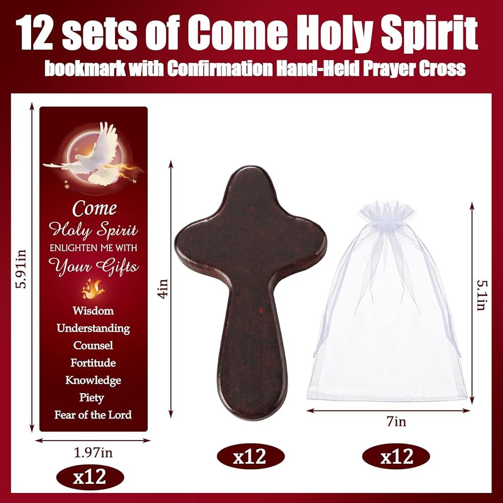Supervitae 24 Pcs/12 Sets Confirmation Bookmark Hand Held Prayer Wooden Cross Gift Bulk Include 12 Come Holy Spirit Christian Bookmarks 12 Hand Held Prayer Wood Cross for Church Religious Gift