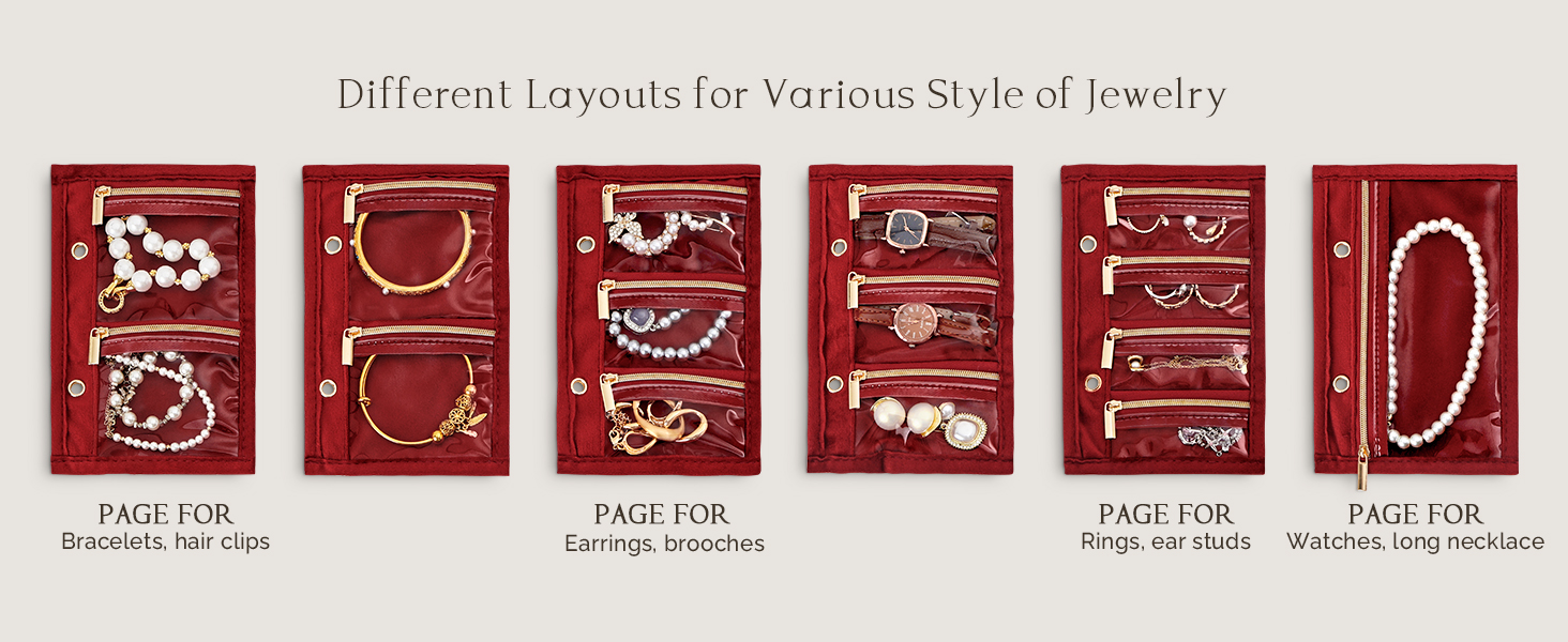 Functional Storage: With 6 removable pages on metal rings, this travel jewelry pouch adapts to any collection. Use the 10 small pouches for rings or studs, 4 medium pouches for delicate studs or barcelets, the large compartments for watches or bold pieces