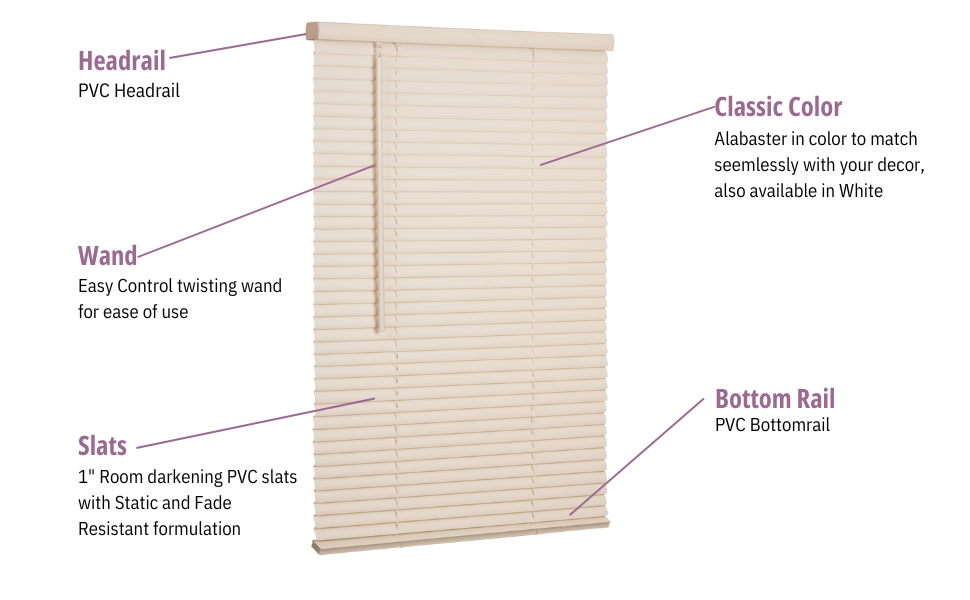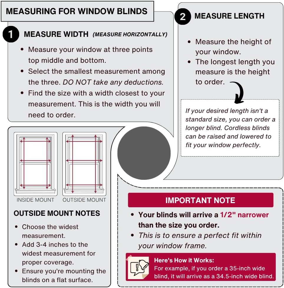 Durable Materials: The 1 Inch Cordless Vinyl Mini Blind is made of durable materials and features light filtering PVC slats to provide privacy, block out light and add style to your home decor. A blind longer than your recorded measurement will work as the blind can be stopped at any position within the window frame.