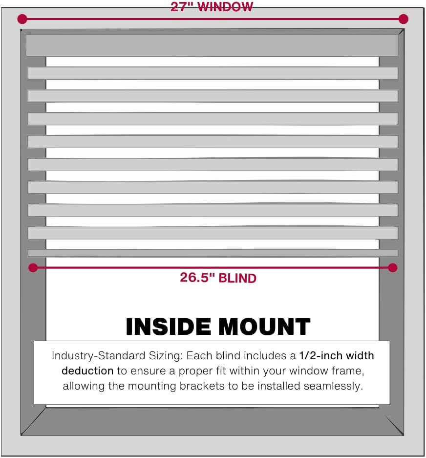 Please note: This window blind is 26.5" wide to allow for mounting the blind inside a 27" wide window. Each blind will be 1/2-INCH NARROWER than the width ordered to fit inside the window frame. Sizes stated within the product descriptions are listed by width then height. See measuring instructions to ensure best fit.