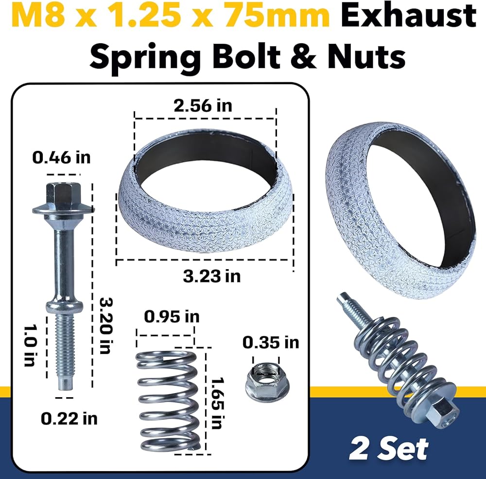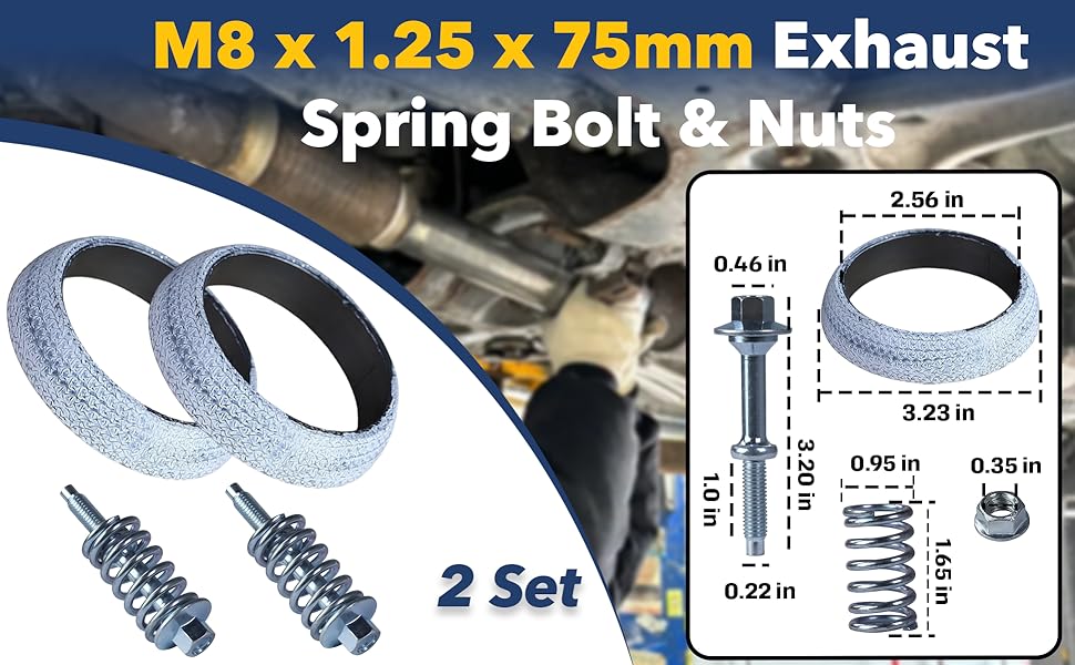 Complete 2-Set Repair Kit Contents:Each kit includes 2 M8 x 1.25 x 75mm spring bolts, 2 matching nuts, 2 high-strength springs, and 1 65mm inner diameter exhaust flange gasket—everything you need for exhaust manifold repairs