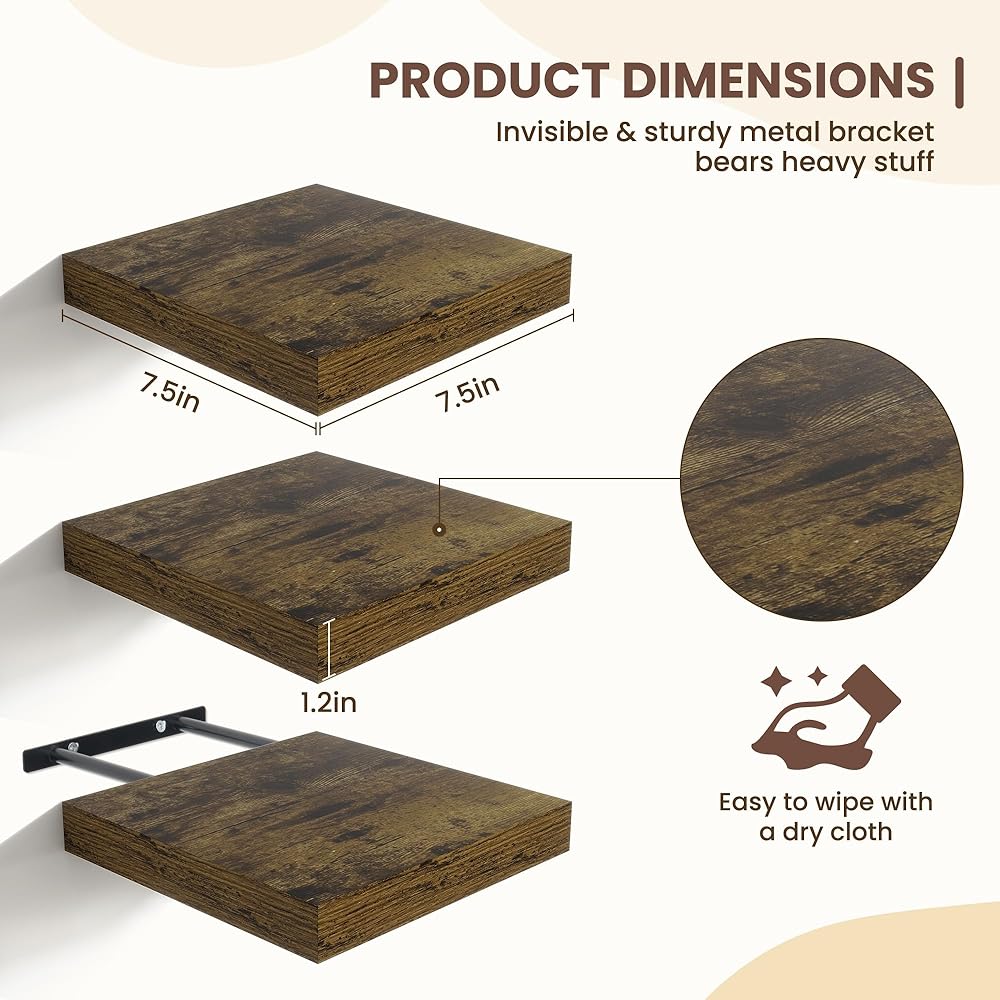 Stylish and Modern Design: This set of 3 floating square shelves (9 inches each) features a sleek matte finish and minimalist aesthetic. Made from durable faux wood, they offer a contemporary storage solution that seamlessly blends with any home décor.