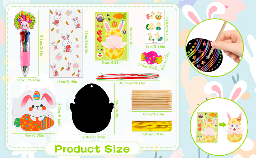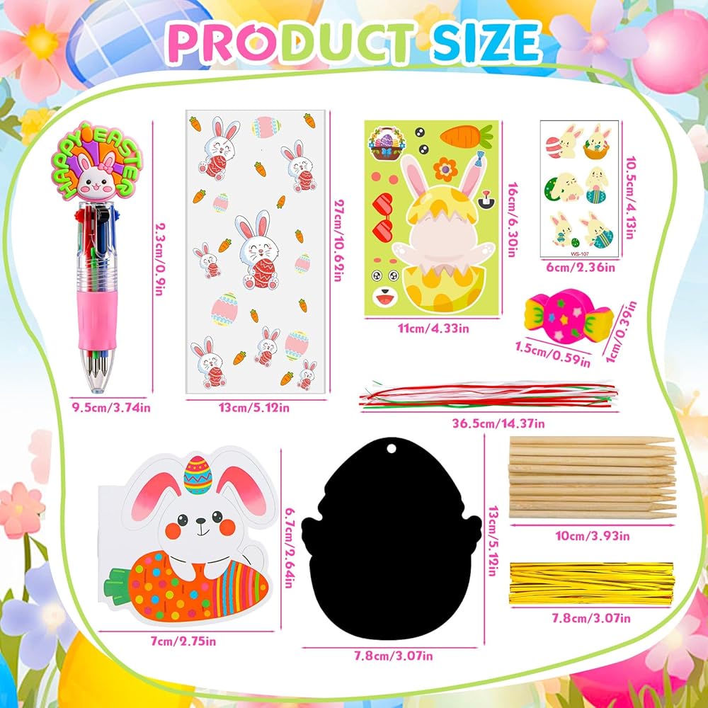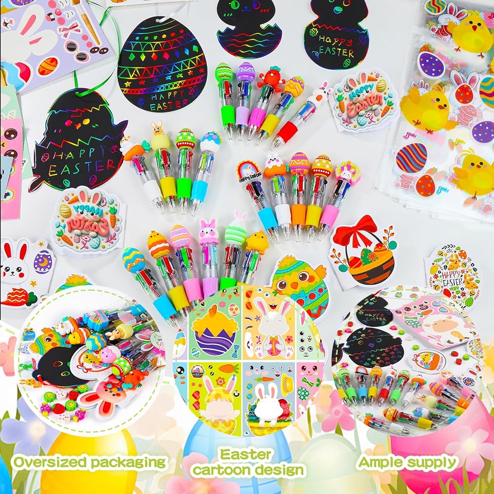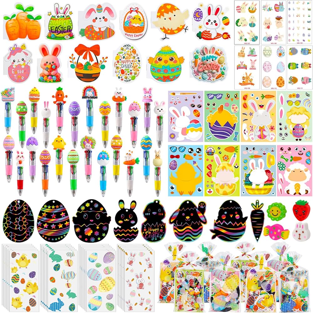 All-in-One Easter Classroom Kit:Each 24 pack includes: 4 styles of party favor bags, 24 mini notebooks, 24 colorful pens, 24 sticker sheets (8 designs), 24 tattoos (6 designs), 24 scratch art kits (8 patterns), and 24 erasers (4 styles). Perfect as easter gifts bulk or birthday goodie bags stuffers.