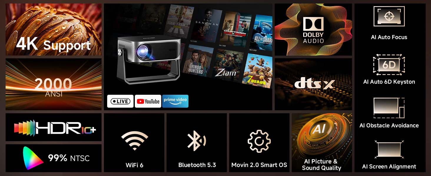 [Pro Dolby Audio & Bluetooth 5.3] Immerse yourself in theatre-quality sound with Dolby-certified speakers and DTS decoding. Thanks to two-way Bluetooth 5.3, this bluetooth projector can pair with external speakers or act as a standalone speaker. With WiFi 6 (up to 9.6 Gbps connection speeds), it ensures smooth streaming and casting, making it a versatile tv projector or phone projector companion—ideal for your home theater projector system.
