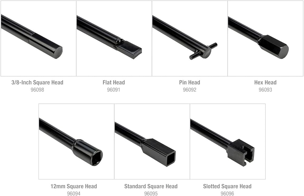 • 【INTERCHANGEABLE HEADS REPLACE OEM TOOLS】 The kit includes the most common head types to act as a direct replacement for your vehicle's original or lost tool: Flat, Pin, Standard (½") Square, Slotted Square, 12mm Square, ⅜-inch Square, and Hex Heads.