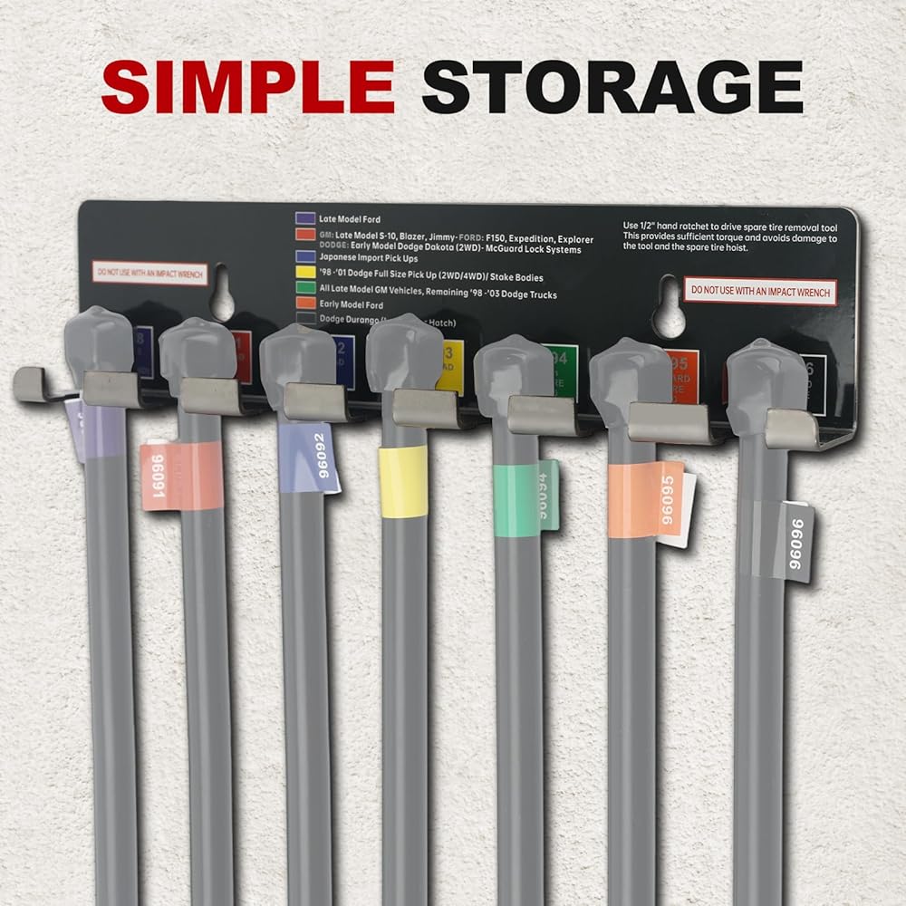 • 【DURABLE & RELIABLE CONSTRUCTION】 Built for professional and DIY use.Each tool is made from powder-coated carbon steel for corrosion resistance and strength.Color-coded heads allow for quick identification, saving you time and frustration when you need to access your spare tire.