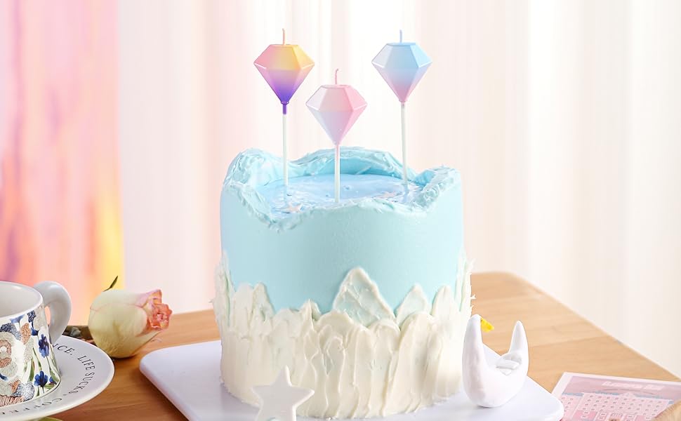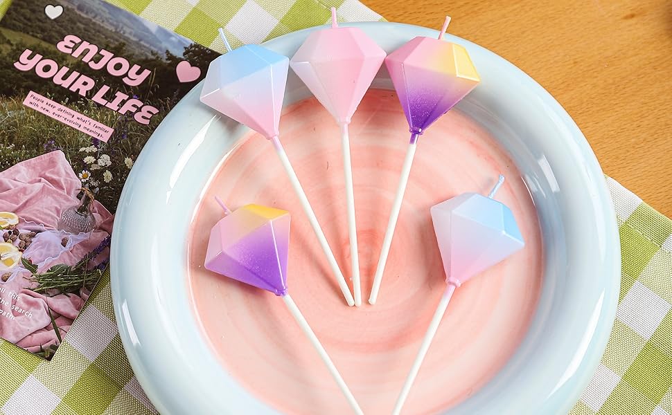 Design: Each birthday cake candle is gradient color, which will give the candles for birthday cake extremely textured individuality and style. The choice of the diamond shaped base makes the entire birthday candle look perfectly vivid and cute, make your birthday cake more brilliant