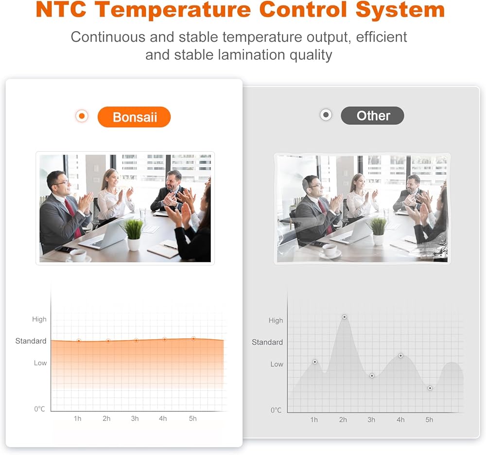 【NTC Temperature Control】 The Bonsaii A3 Laminator Machine features NTC temperature control, ensuring a stable laminating effect. With precise temperature control, you can achieve optimal laminating results.