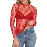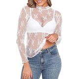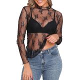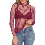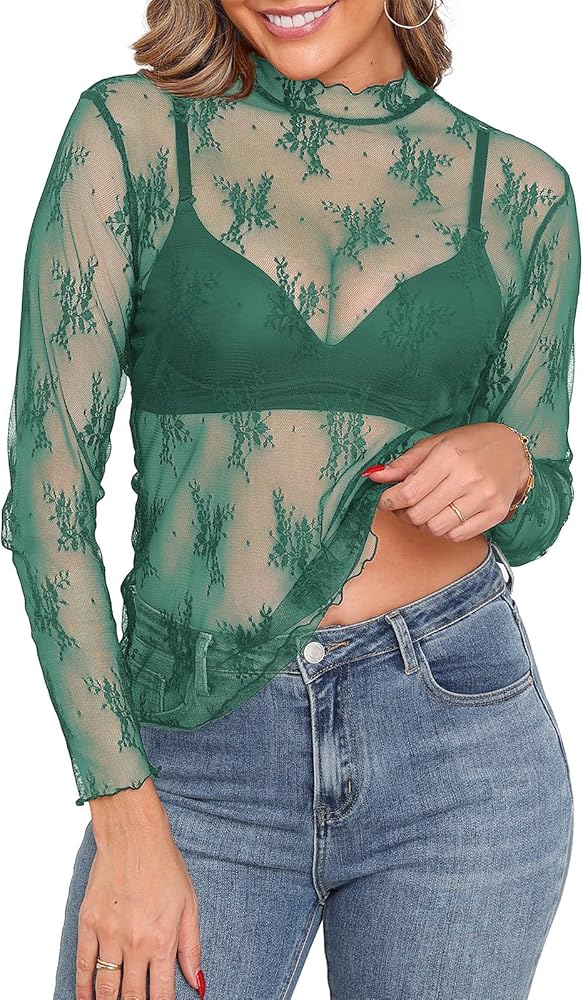Features: This women's sheer top stands out with elegant floral embroidery and delicate lace fabric, paired with a stylish mock neck and ruffled hem for a feminine touch. The long sleeves add versatility, while the slim-fit silhouette enhances your curves—striking the perfect balance between elegance and boldness to elevate any outfit.