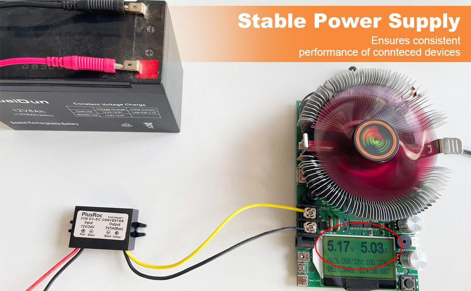 - Stable Power Supply: Output Voltage: DC 5V; Output Current: Max. 5A; The power converter maintains 5V output even at full 5A load.