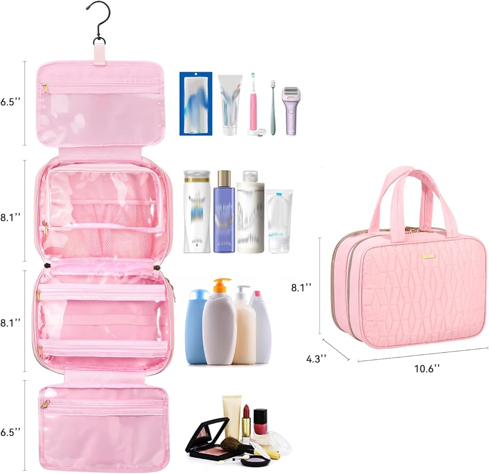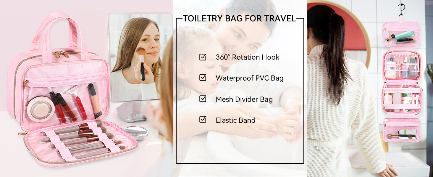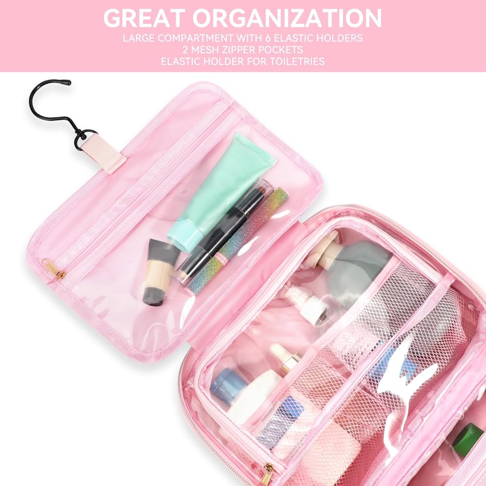 Considerable Organization: The toiletries bag feature 4 separate compartments for all bathroom items and backside pocket for makeup items. Transparent PVC provides easy, full-view access to your belongings and dry-wet separation,your toothbrush and towel can be stored after use without wetting other items. Elastic bands can keep toiletry bottles upright, preventing liquids from escaping and causing a mess.