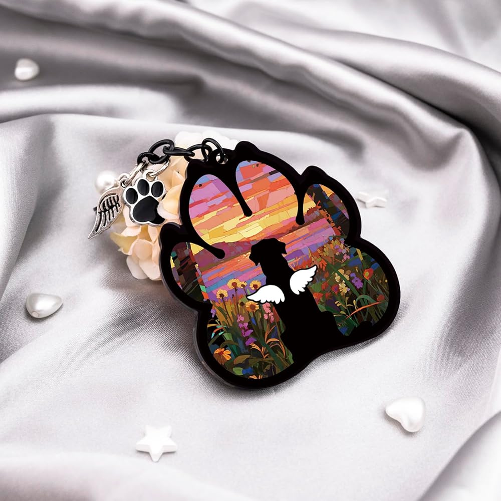 This unique keychain is the dog memorial gifts for loss of dog.The edges of the keychain are smooth and delicate, and will not scratch the skin or clothes.The paw - shaped acrylic charm with a sunset - gazing dog isn't just cute—it's a portal to memories.Crafted from durable acrylic, this keychain is built to last—just like the love for your dog.It's more than an accessory; it's a promise: "I'll carry your memory forever—because you're not just a pet, you're family."