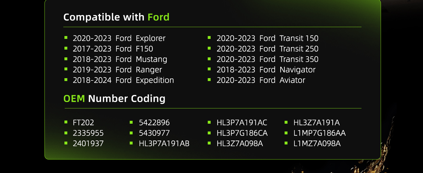 Compatibility: Trans filter kit compatible with Ford 2017-2023 F150丨2020-2023 Explorer丨2018-2023 Mustang丨2019-2023 Ranger丨2018-2024 Expedition丨2018-2023 Navigator丨2020-2023 Aviator丨2020-2023 Transit 150/250/350. Replace OE: FT202, 2335955, 2401937, 5422896, 5430977, HL3P7A191AB, HL3P7A191AC, HL3P7G186CA, HL3Z7A098A, HL3Z7A191A, L1MP7G186AA, L1MZ7A098A. Before ordering, please verify that the model and part number meet your needs and ensure compatibility.