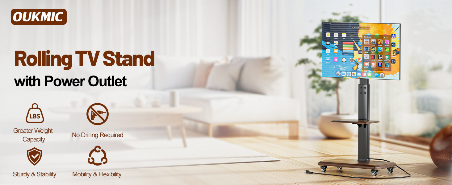 Flexible Height Adjustment: OUKMIC rolling TV mount offers 4 height adjustments, providing a comfortable viewing angle and immersive experience by adjusting the TV to an eye-level position