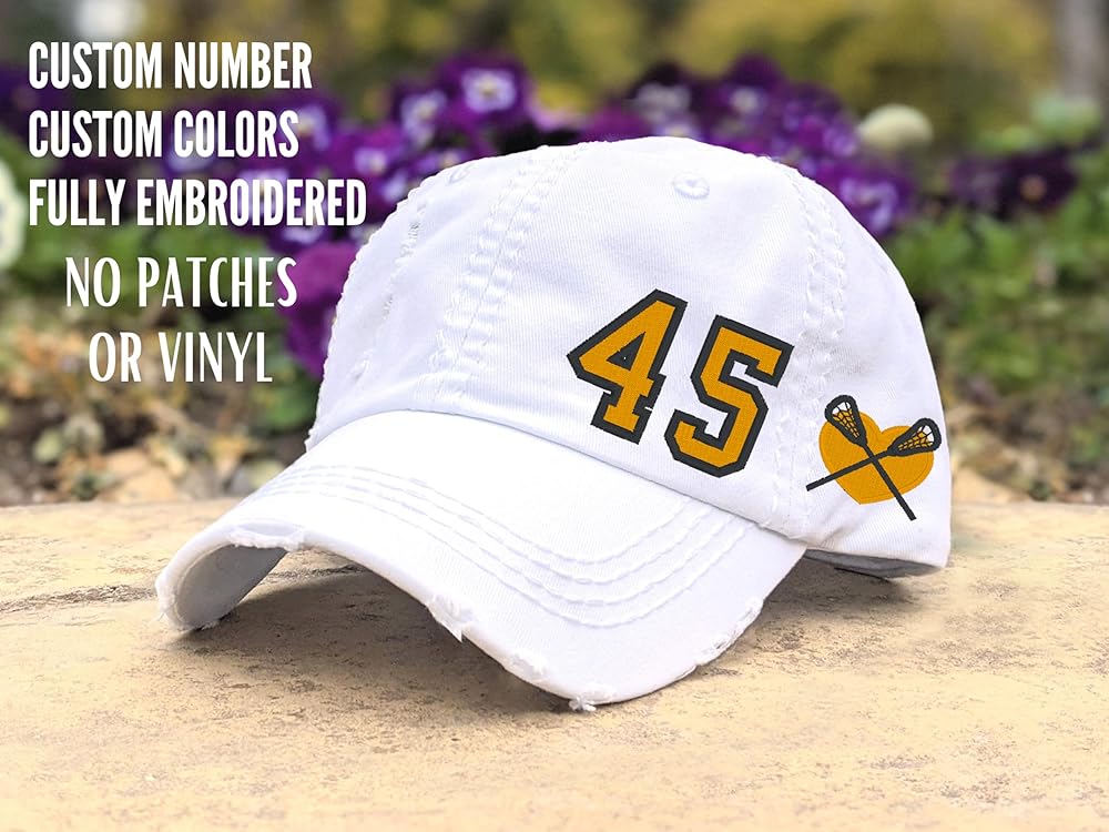 Distinct Headwear women's distressed, 100 percent cotton, embroidered custom lacrosse number hat. Your choice of cap color and thread colors. Each cap is made from scratch with your custom number and custom colors. Optional upgrade to a high ponytail/messy bun cap. Ladies fit, soft, mesh-free cap with matching faux leather back buckle on most hat backs. White high ponytail caps have an adjustable fabric back strap instead of the faux leather buckle. All other caps, including white baseball caps have the faux leather buckle back. Price is per cap.